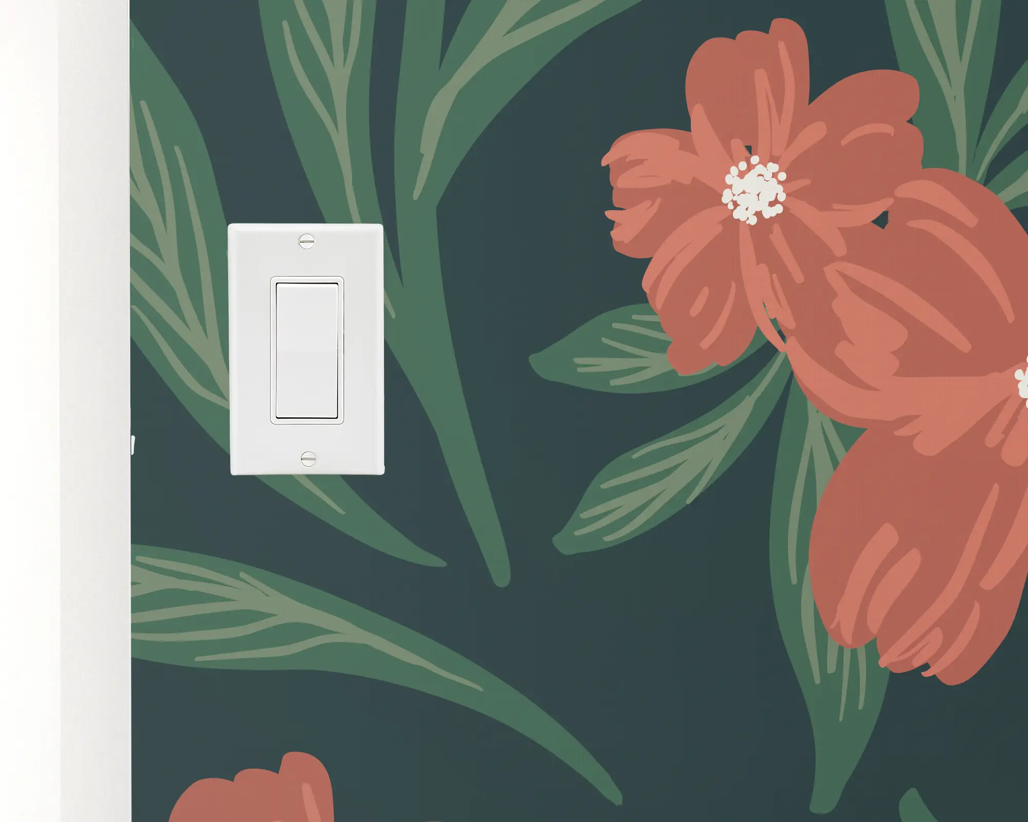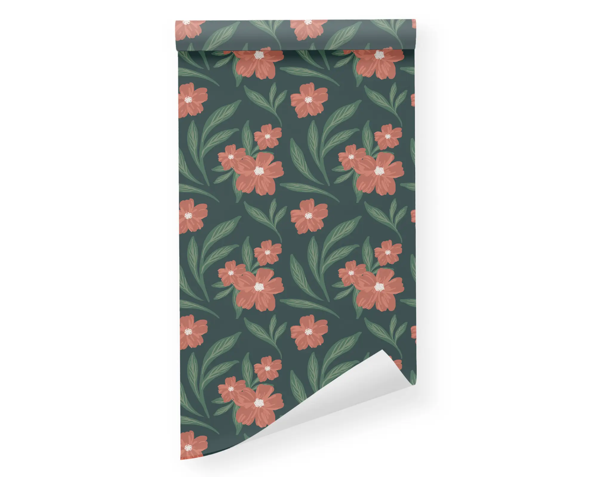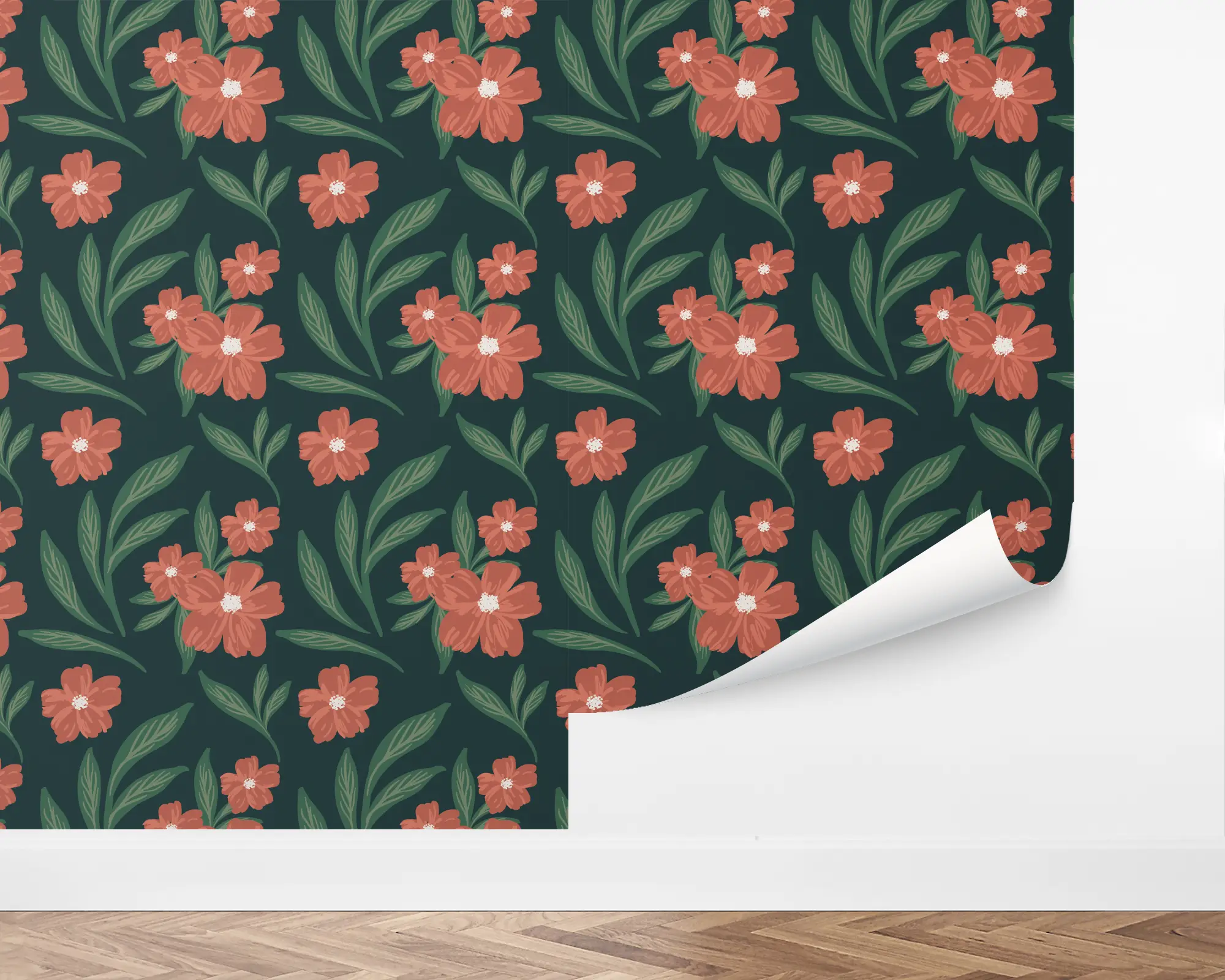 Add some floral intrigue to any space with our lovely Autumn Blooms peel and stick removable wallpaper! This design features a dark green background that helps the salmon flowers pop at the front of the scene.