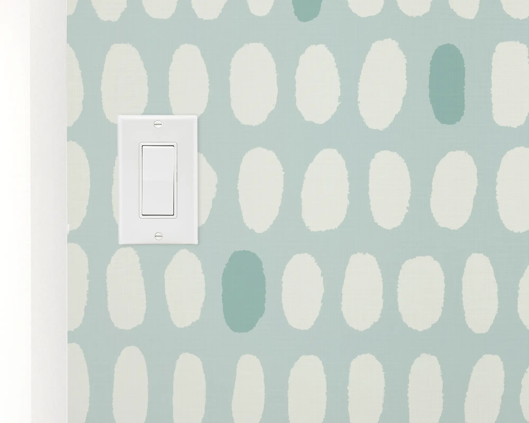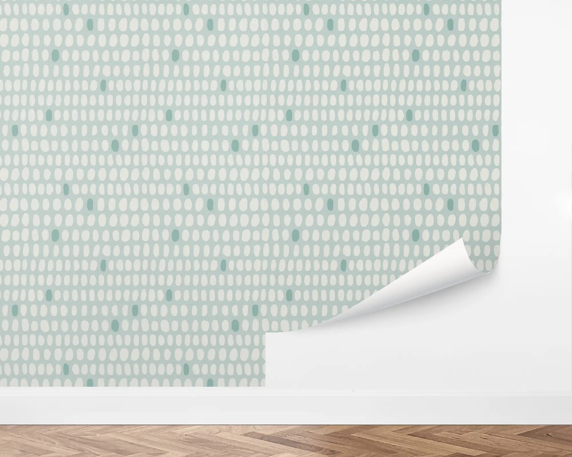Our Beach Pebbles peel and stick removable wallpaper satisfyingly aligns abstract stones across your walls! Against a muted blue background, neutral colored stones are arranged in rows, with the occasional one in a deep teal.