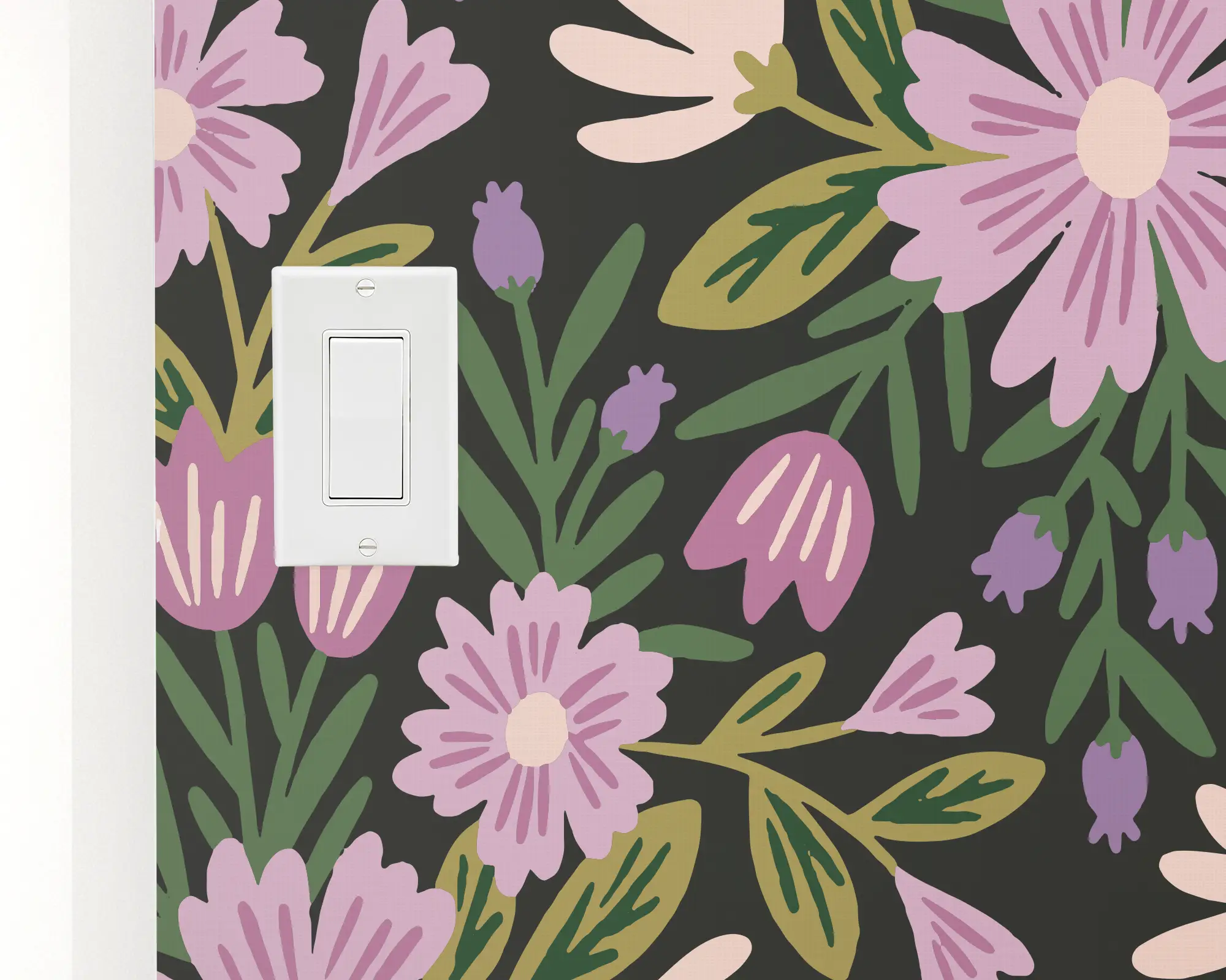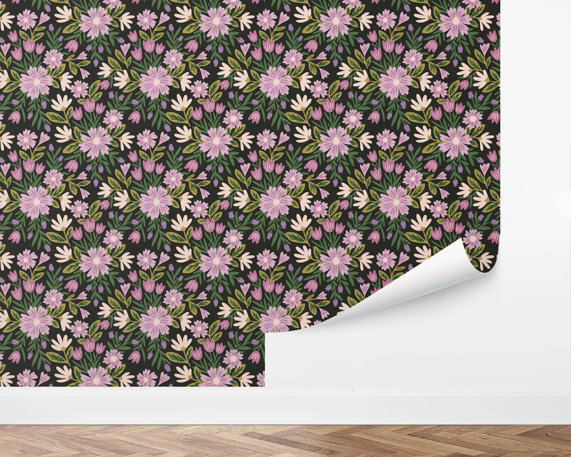 Dress up any play space with our Bold Whimsy Peel and Stick Wallpaper. This playful design features bouquets of daisies, tulips, and foliage over a dark background. Fully customizable with any of our dazzling colors, this removable wallpaper is the perfect way to wow friends.
