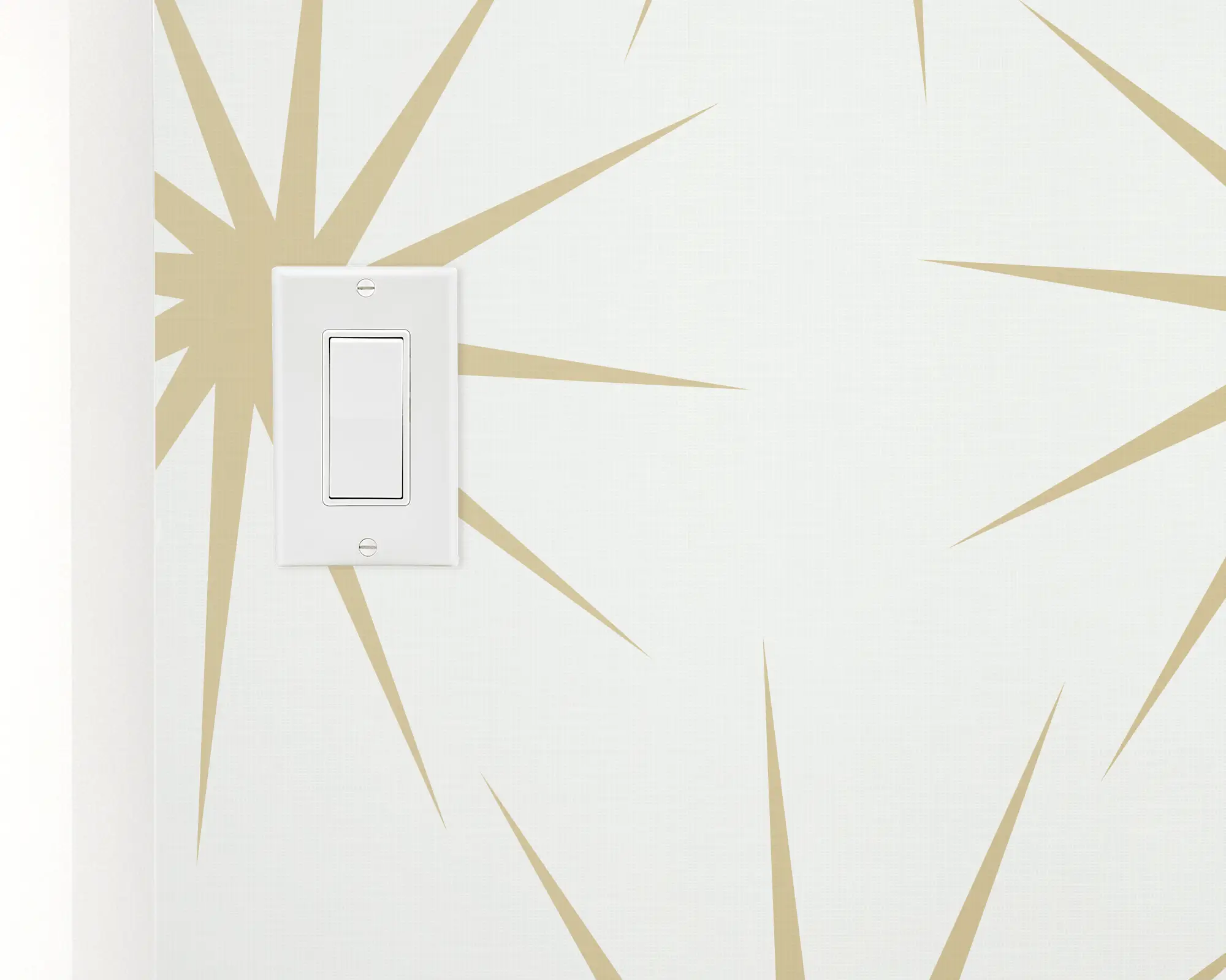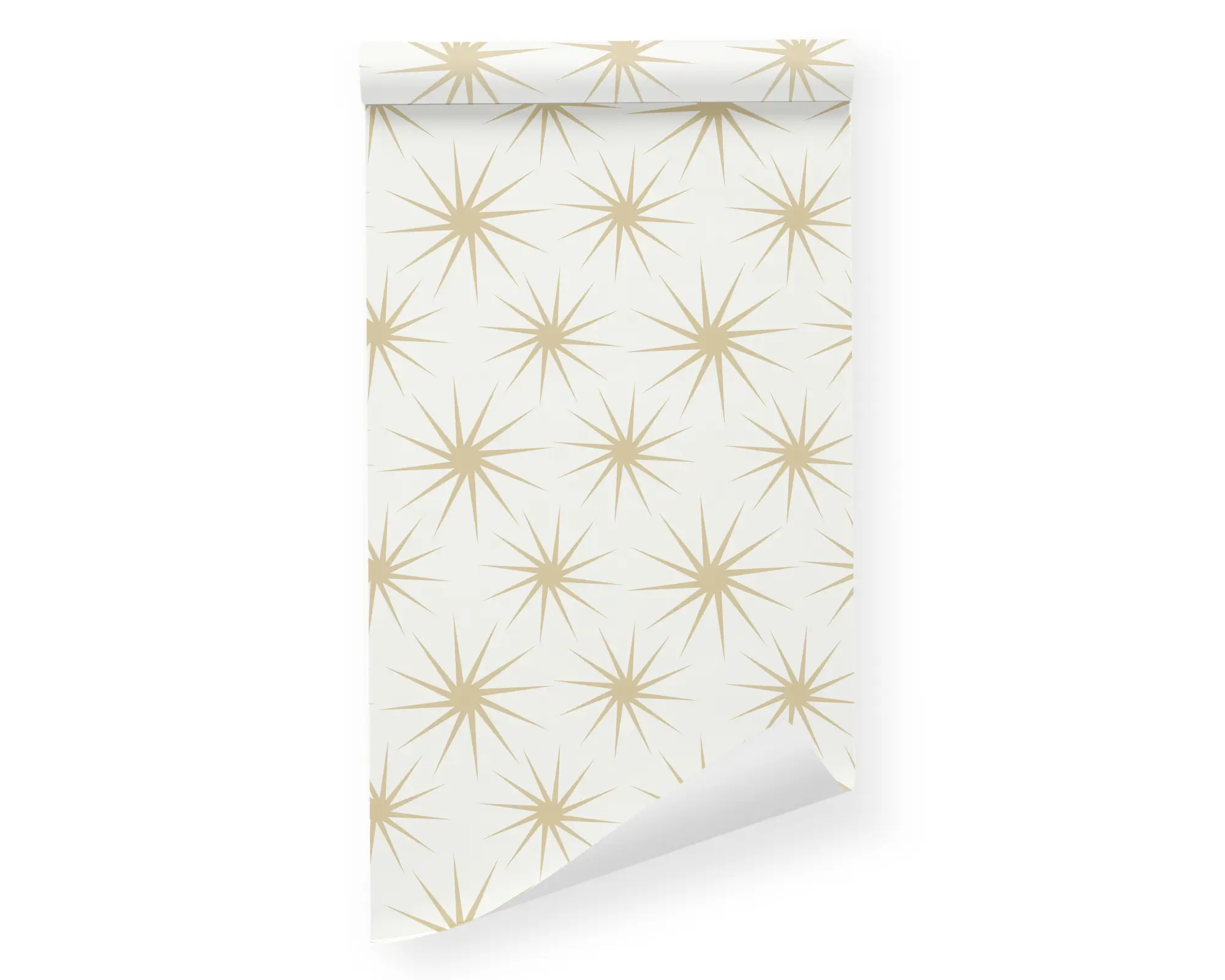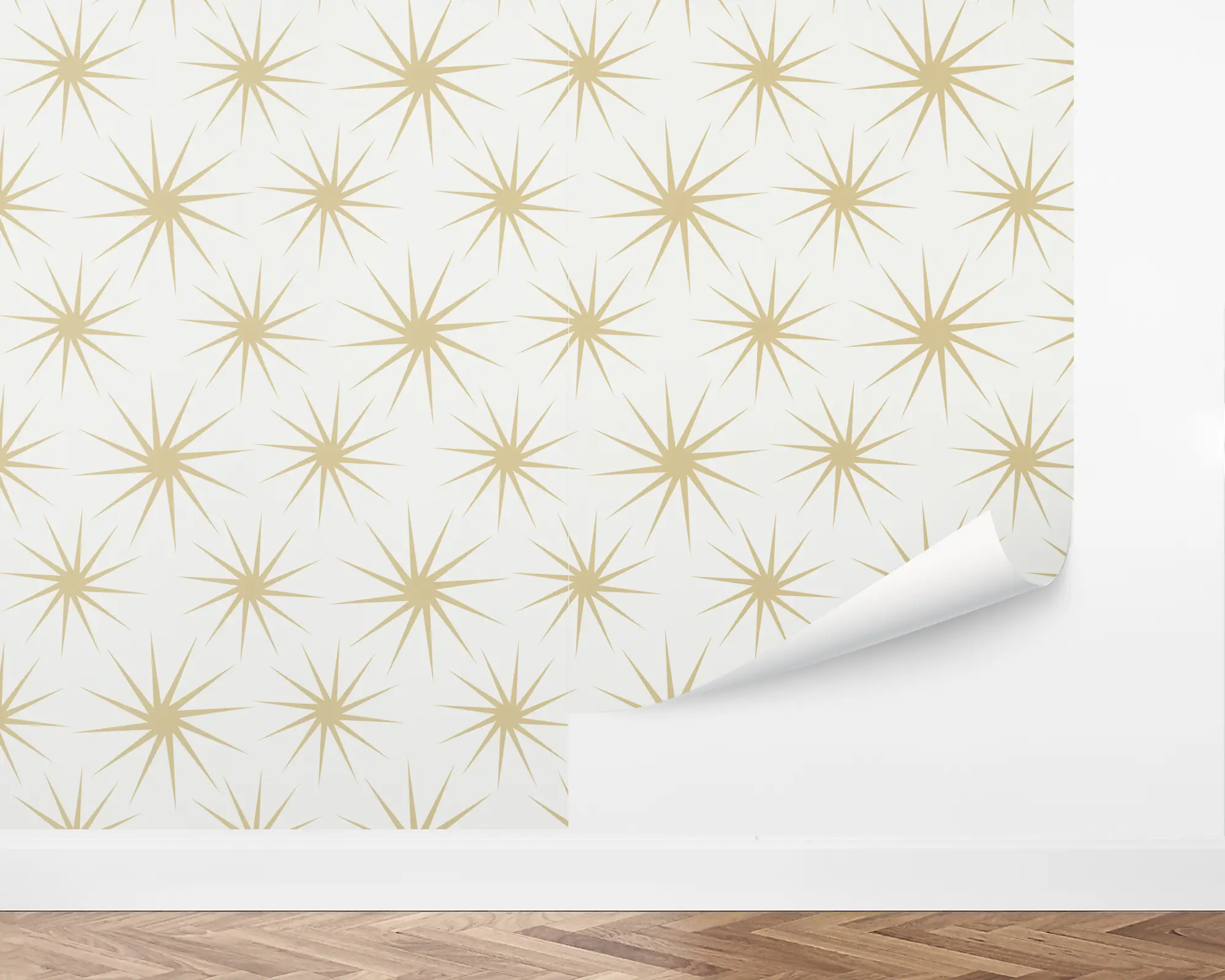 The Celestial Bursts Peel And Stick Removable Wallpaper will add a pop of pattern to any wall in your interior. Yellow star bursts are displayed on a neutral off-white background. Customize this design to fit your personal style and the interior of your home!