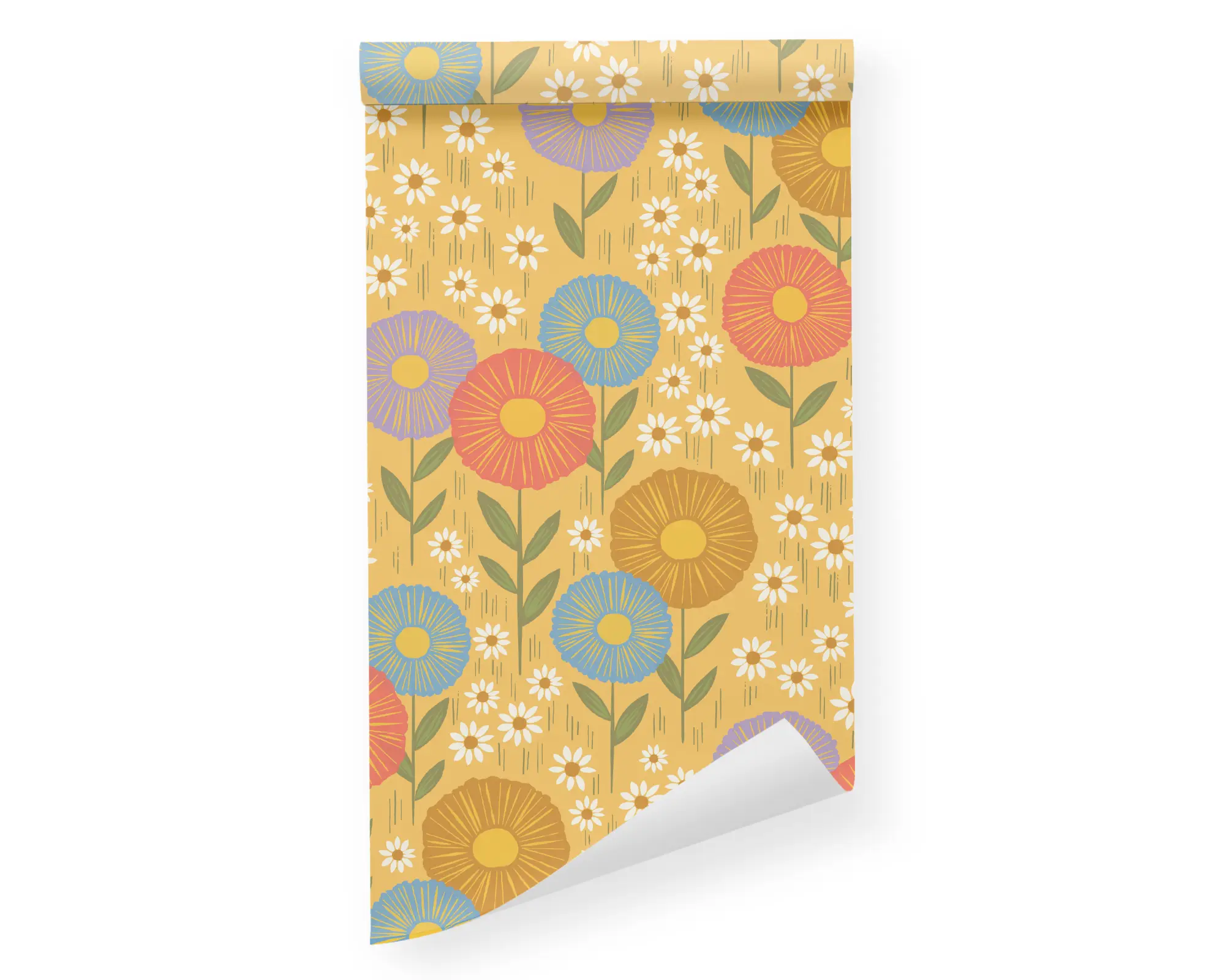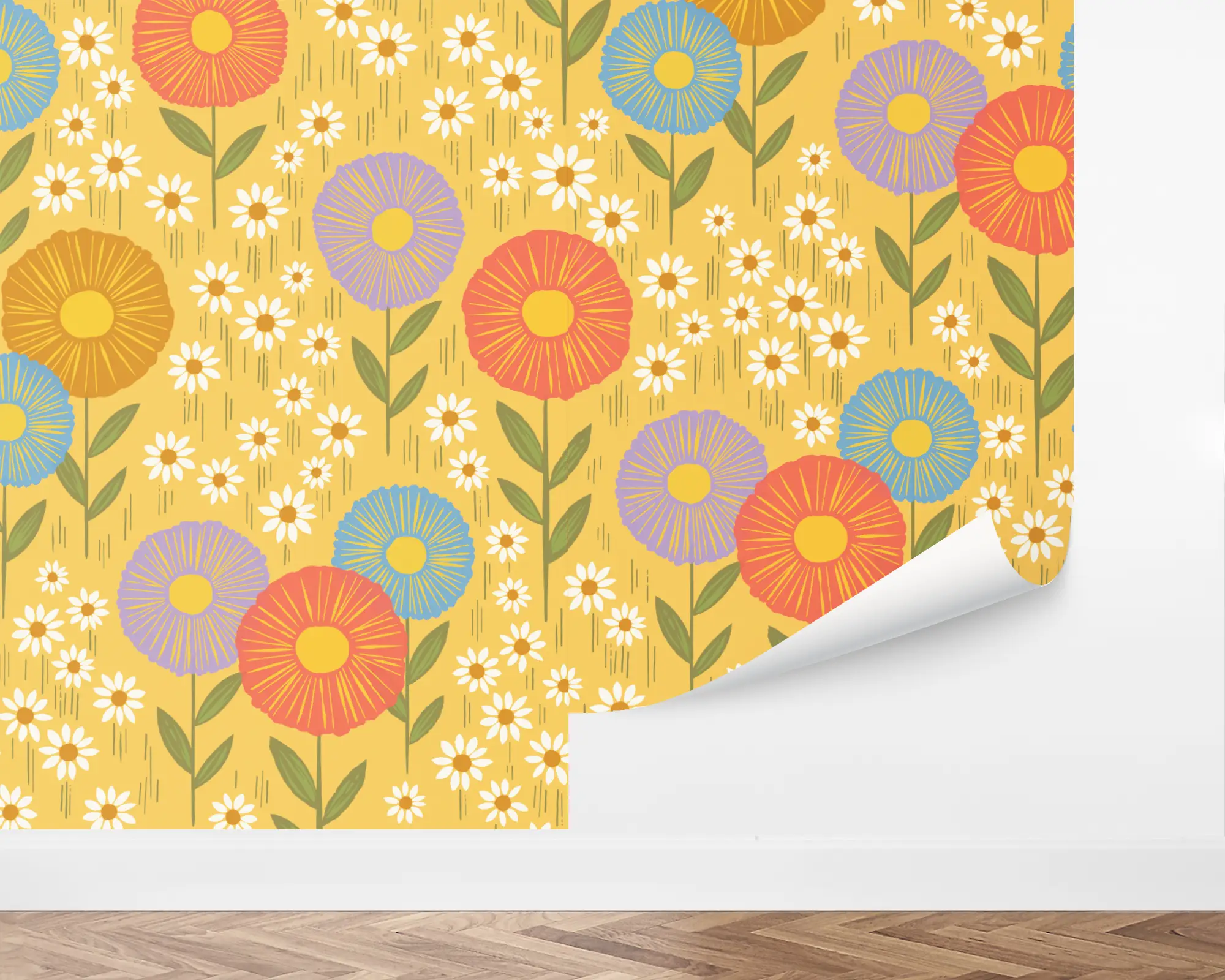Our Daisy Field Peel and Stick Wallpaper is the perfect way to brighten up your child's bedroom or playroom while adding a touch of greenery. Colorful illustrations of flowers sprout on top of a marigold background. Personalize with endless combinations of colors to match your personal style!