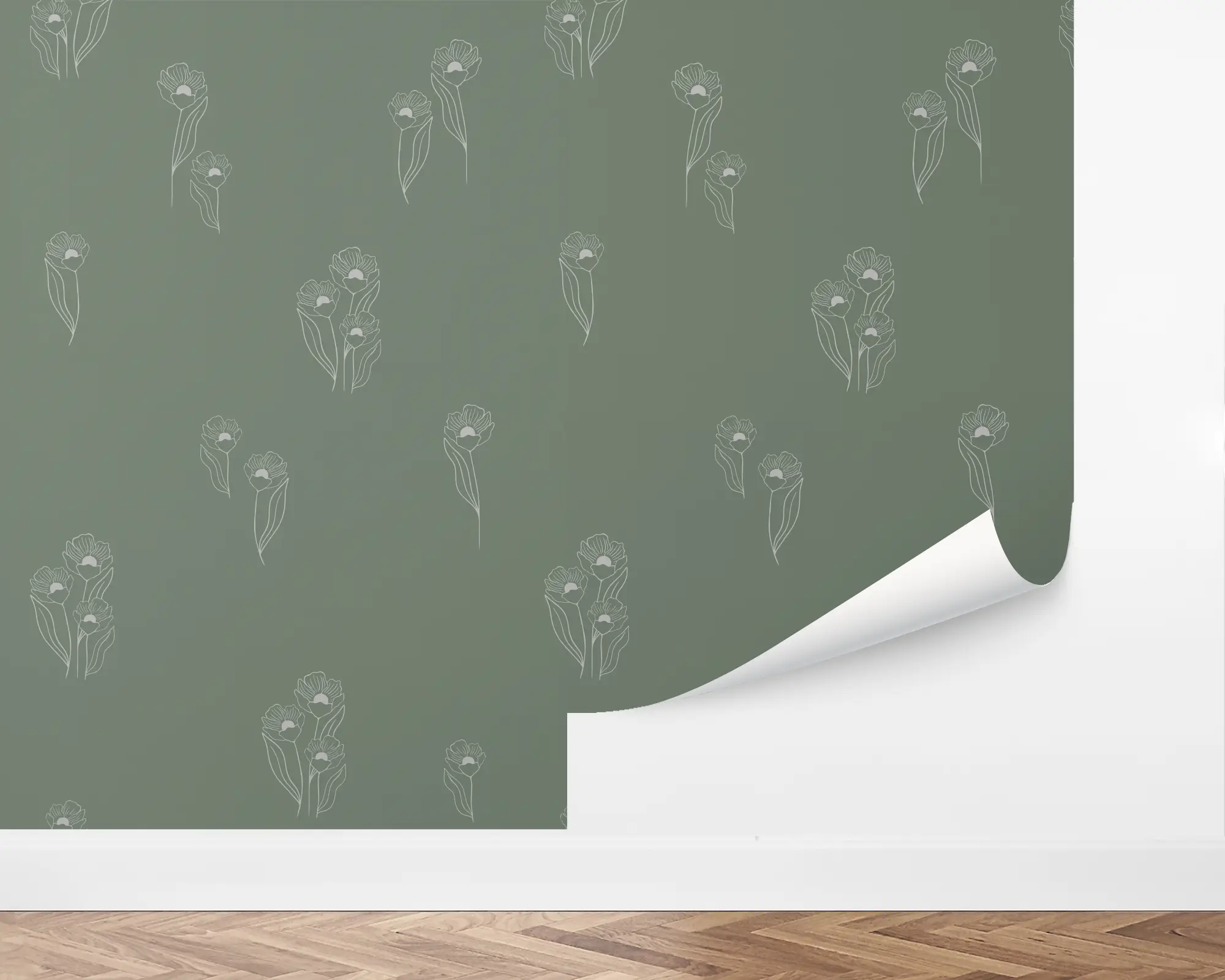 Our Flower Field peel and stick removable wallpaper is the perfect, delicate floral design to add interest to any space! Against a lovely green background, detailed line illustrations of grey flowers are spread across the design.