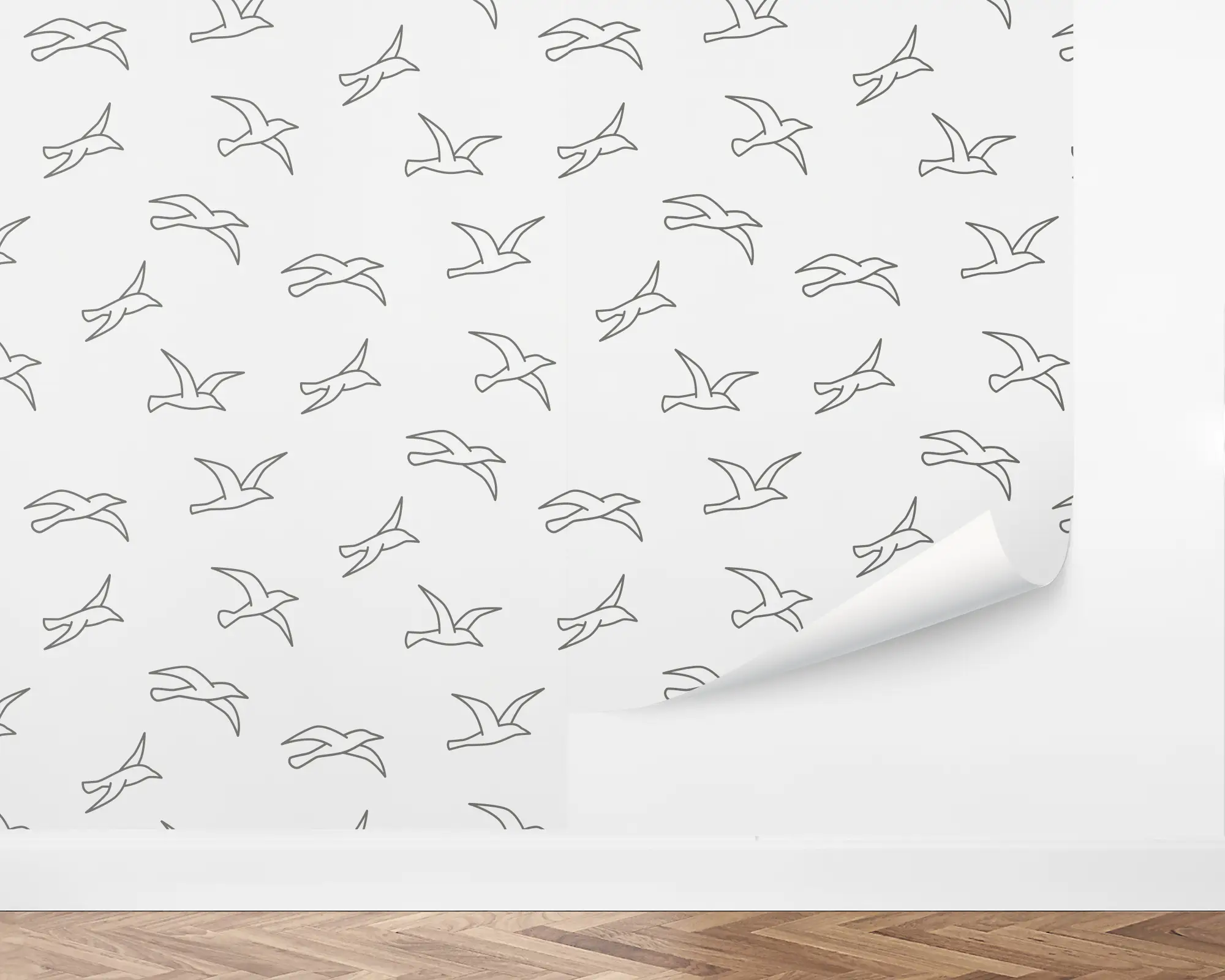 Breathe some life into your space with our Flying Birds Peel and Stick Wallpaper. This classic design features outlined seagulls soaring over a light background. Fully customizable with any of our beautiful colors, this design is perfect for any modern or coastal interior design theme.