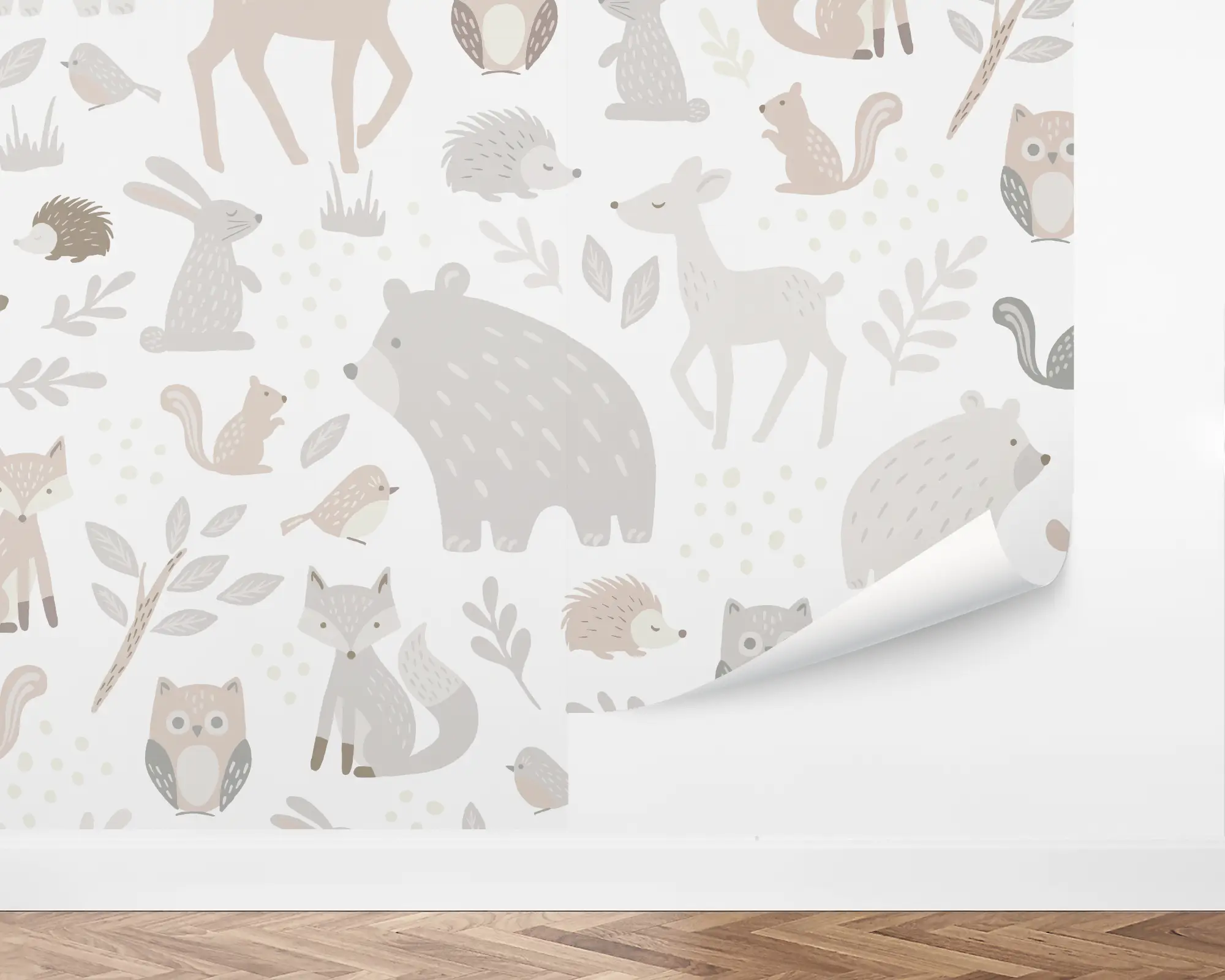 There's nothing more tender than a child looking up from their pillow to a room of our Forest Friends Peel And Stick Removable Wallpaper dancing around their bed! An assortment of deer, bears, birds, and smaller critters is arranged across a white background, while simple foliage decor is nestled in-between.