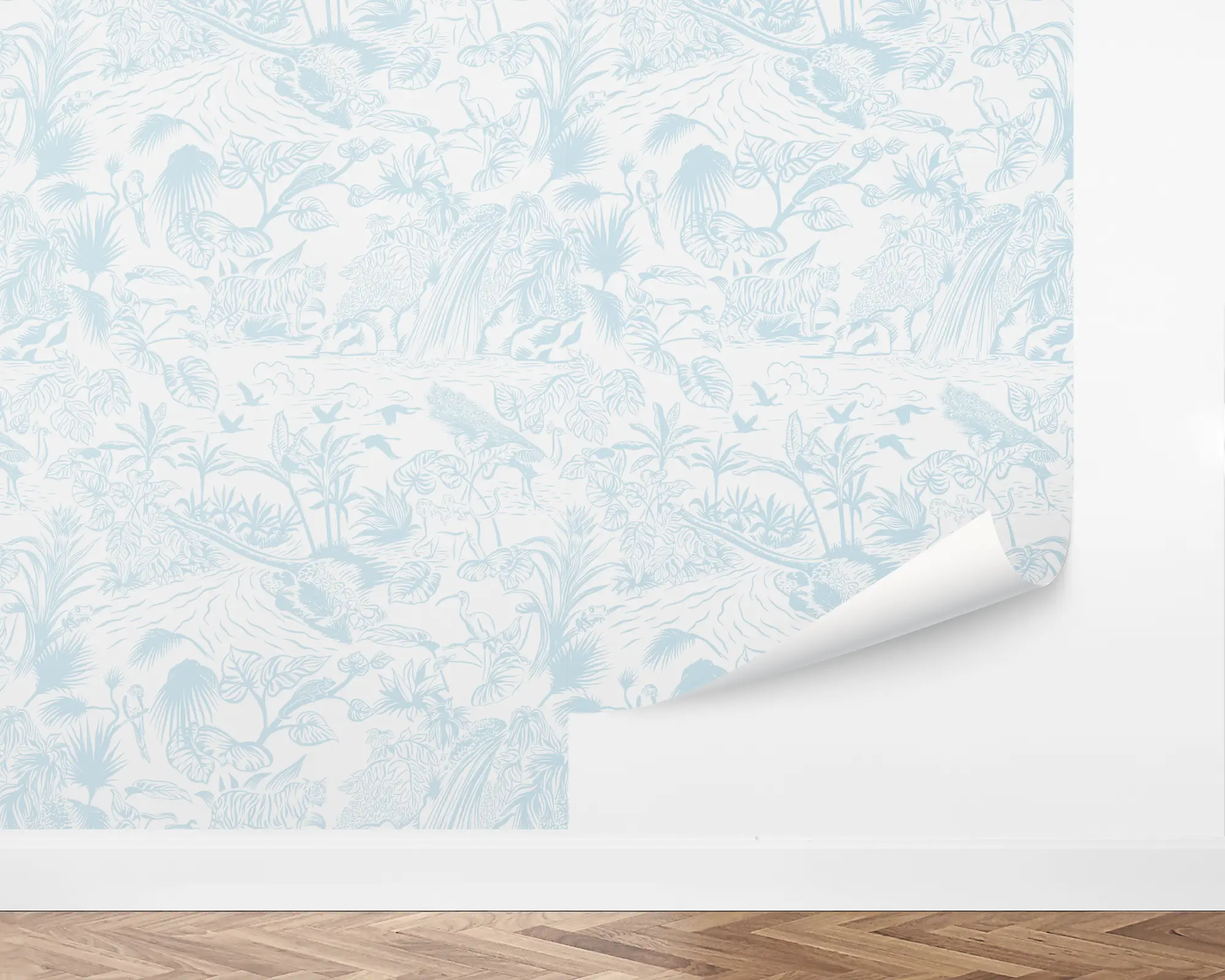 Create some energy in your home with our In The Jungle Wallpaper Peel and Stick Wallpaper. This exciting design features an intricate jungle scape of rivers, trees, and wild animals. Fully customizable with any of our stunning colors, this wallpaper is perfect for anyone with an adventurous heart.