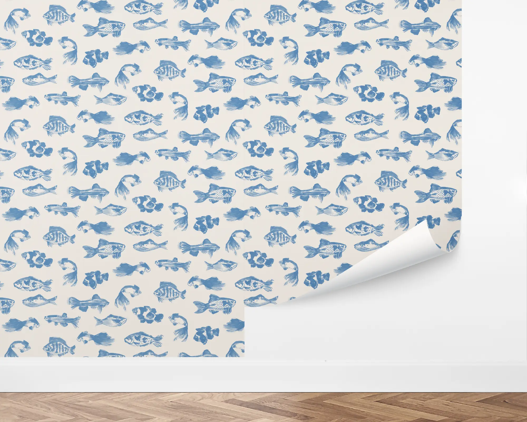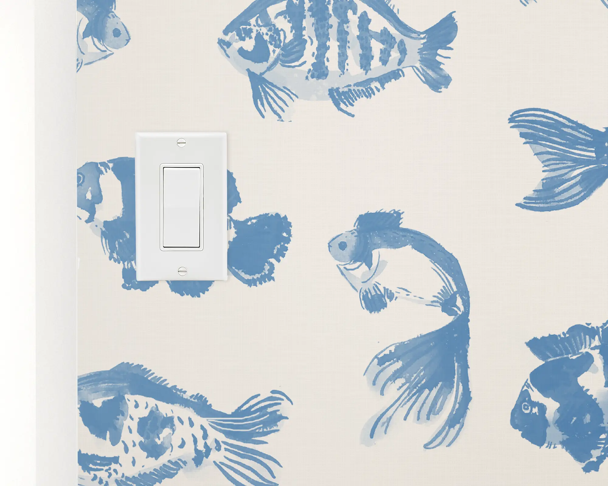 Create a unique space with our Inky Fish Wallpaper. This fun design features monochromatic, tropical fish over a neutral background. Fully customizable with any of our beautiful colors, this wallpaper, is the perfect way to make a statement in any room.