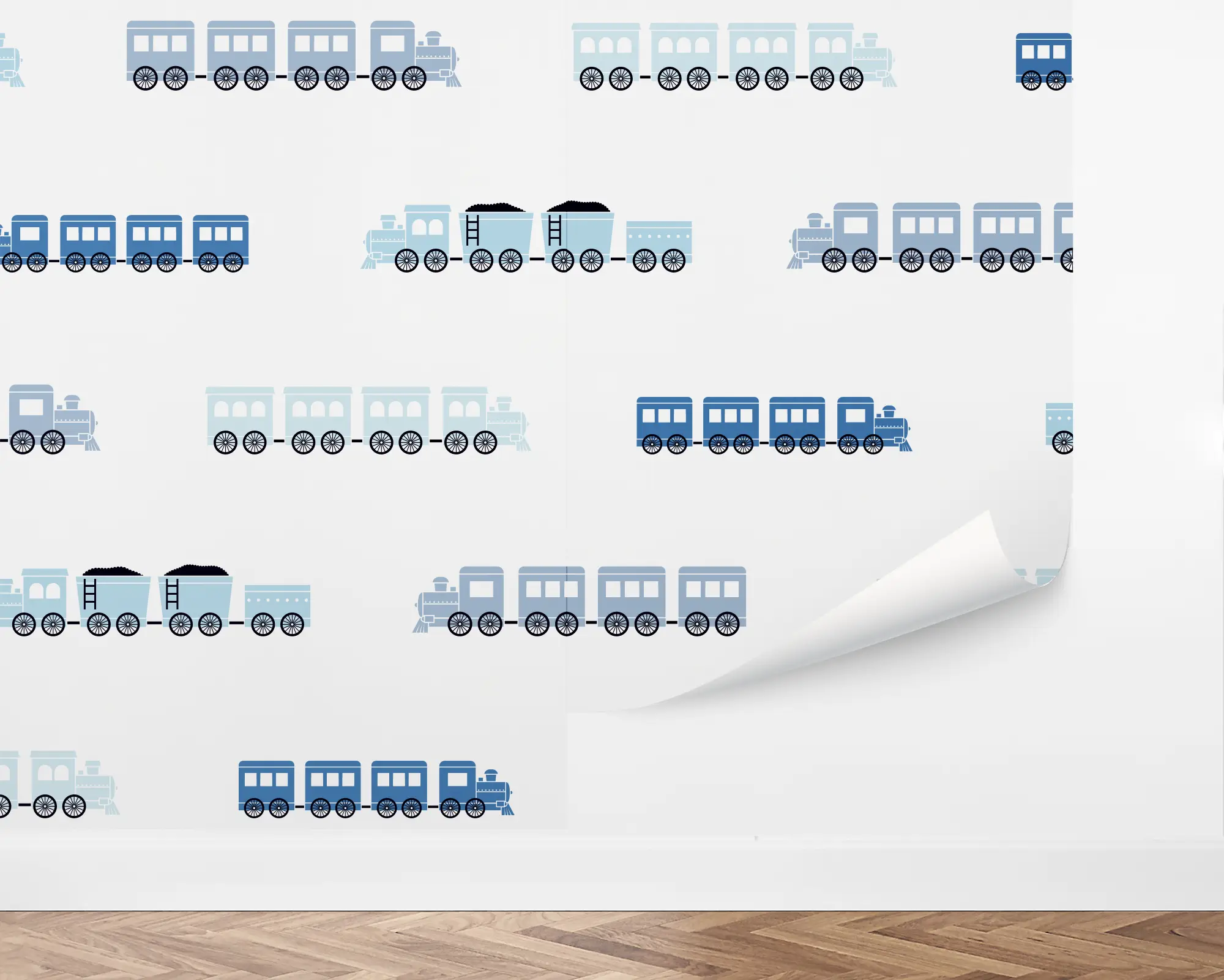 Create the nursery, playroom, or bedroom of your dreams with our Tiny Trains Peel And Stick Removable Wallpaper. This fun design features softly colored trains scooting across a white background. Fully customizable, this wallpaper is the perfect way to invent the perfect space.