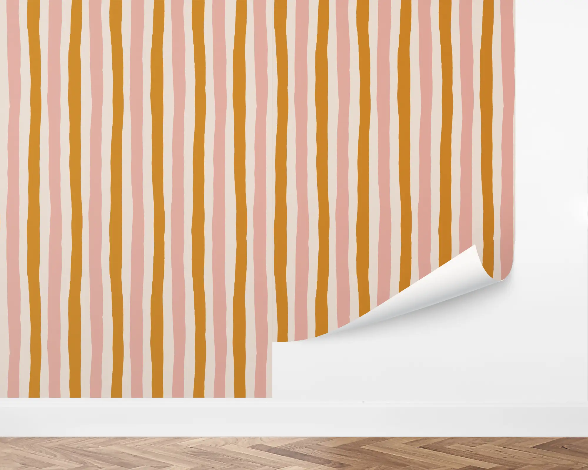 Our Brushed Stripes Peel And Stick Removable Wallpaper adds a retro accent to any wall in your home. Burnt and kiss handdrawn stripes are vertically placed on top of a powder background. Customize with endless color combinations to match your interior style perfectly!