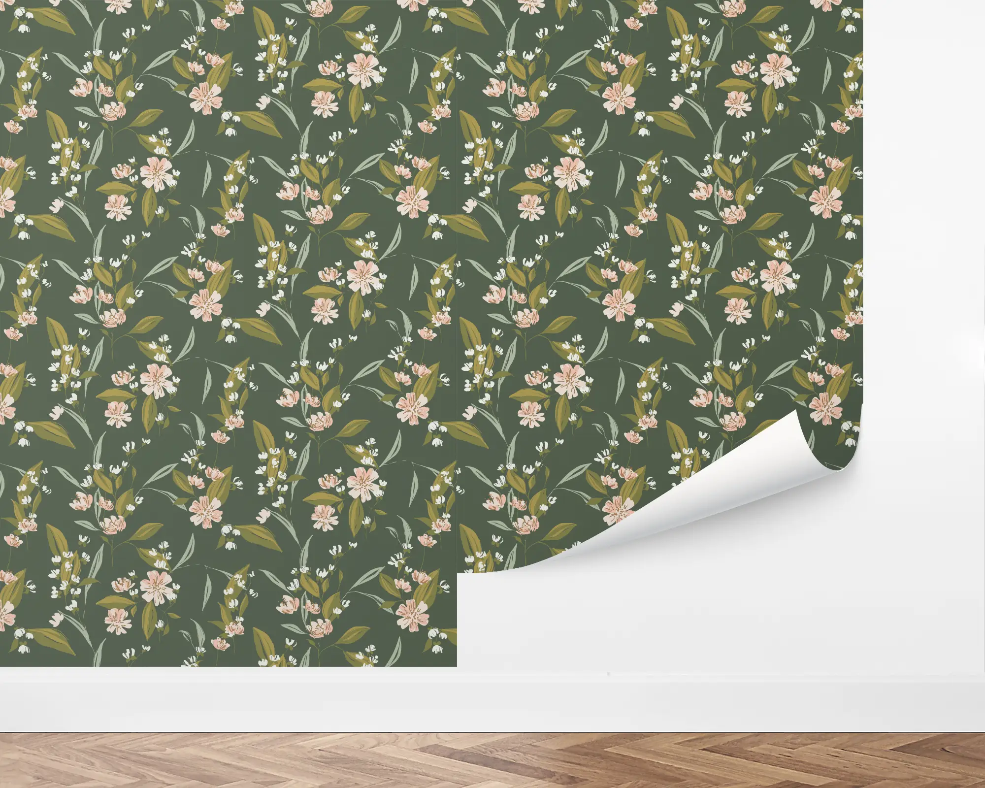 Create a beautifully serene aesthetic with our Bursting Field Peel and Stick Wallpaper. This design features dainty yet lush florals over a dark green background. Fully customizable with any of our gorgeous colors, this removable wallpaper is the perfect way to refresh your interior design.