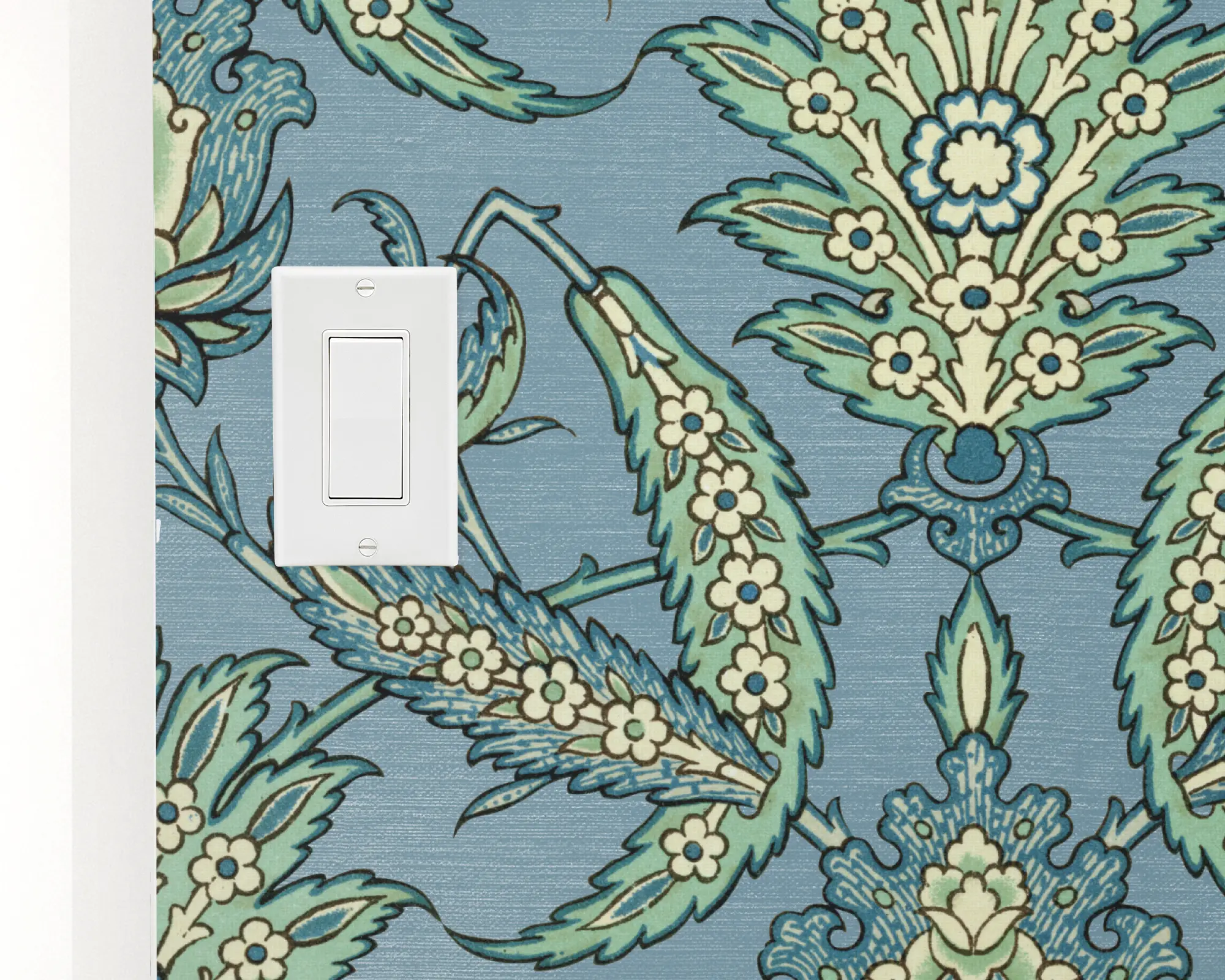 Create an enchantingly antique look with our Classic Arabesque Peel and Stick Removable Wallpaper. This stunning design features a traditional motif of botanicals over a light blue background. Customizable with any of our colors and paper types, this wallpaper is perfect for any grand millennial or vintage style.