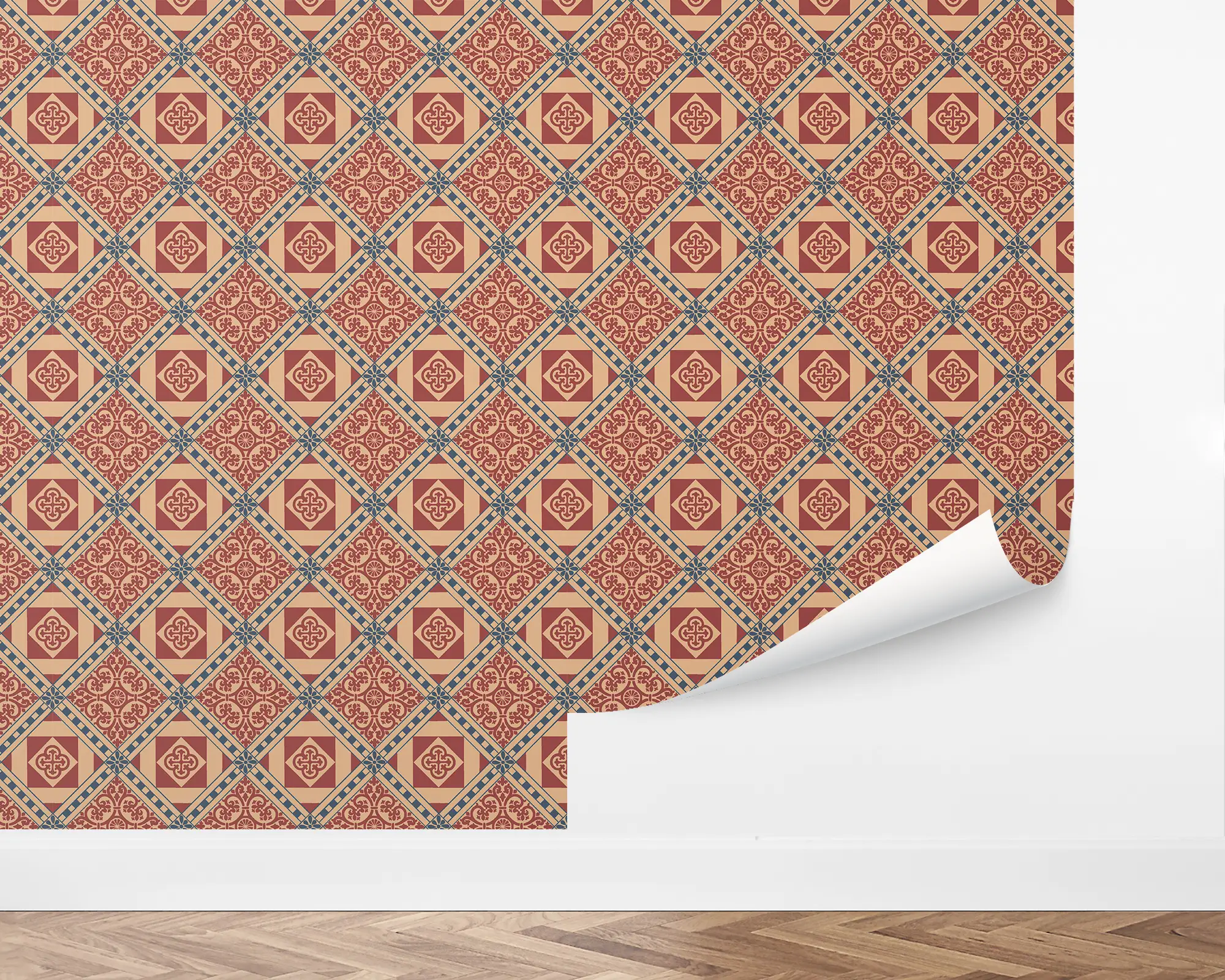 The Crafted Pavements Wallpaper brings artisan charm to your space with its geometric tile-inspired pattern in warm terracotta, cream, and muted teal tones. Reminiscent of handcrafted Mediterranean tiles, this design blends tradition and modern style—perfect for dining rooms, kitchens, or eclectic interiors. Add timeless texture and warmth with this removable peel and stick wallpaper that’s renter-friendly, easy to apply, and available in over 200 customizable colors.