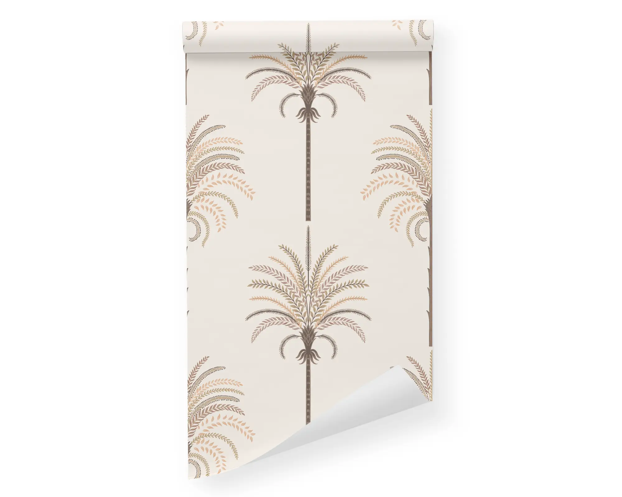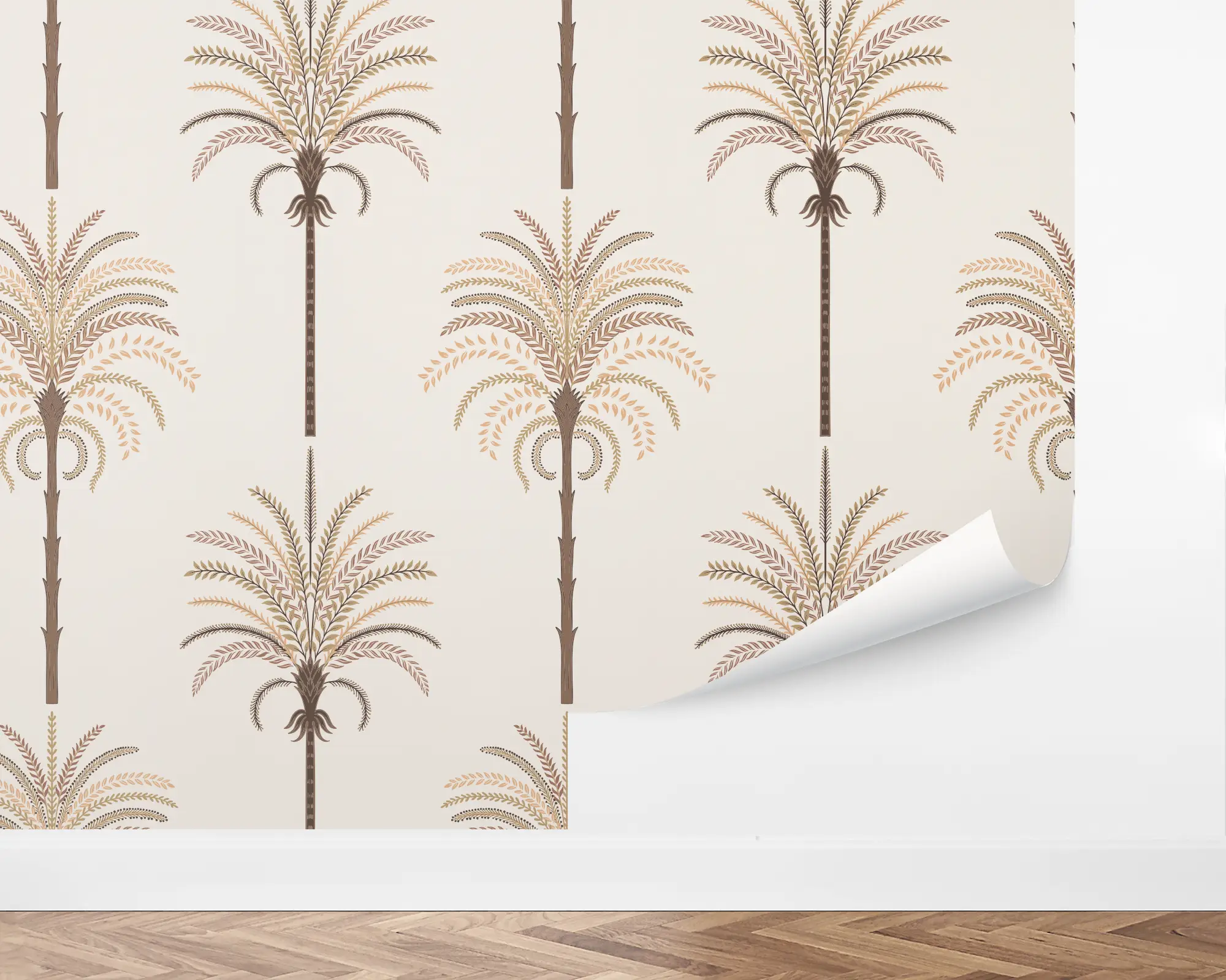Decorative Palms Wallpaper features elegant, stylized palm tree motifs in warm brown and golden hues arranged in a clean, vertical repeat over a soft cream backdrop. The refined tropical design blends Art Deco charm with coastal sophistication—perfect for dining rooms, hallways, or vacation-inspired interiors. Peel and stick application with over 200 customizable colors makes this wallpaper as flexible as it is stylish.