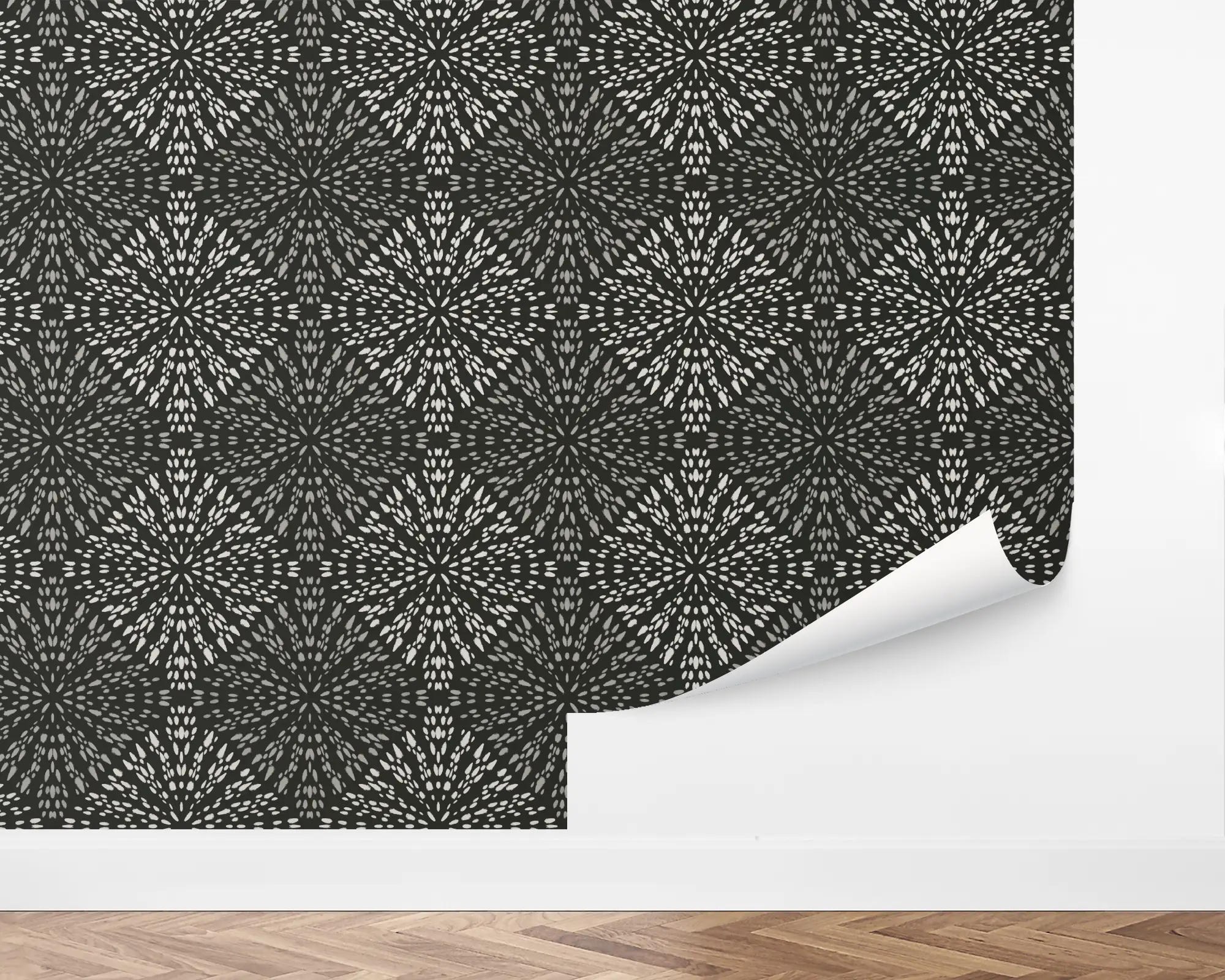 This Inking Dots Wallpaper showcases a bold geometric floral design created with hand-drawn dot patterns for a striking modern look. The high-contrast black and white palette makes it a versatile choice for accent walls, dining rooms, hallways, or creative studio spaces. With its peel and stick application, this removable wallpaper offers an effortless way to transform any room with artistic style and timeless elegance.