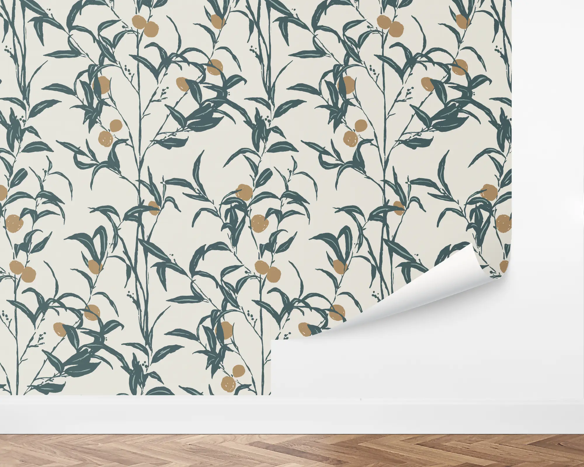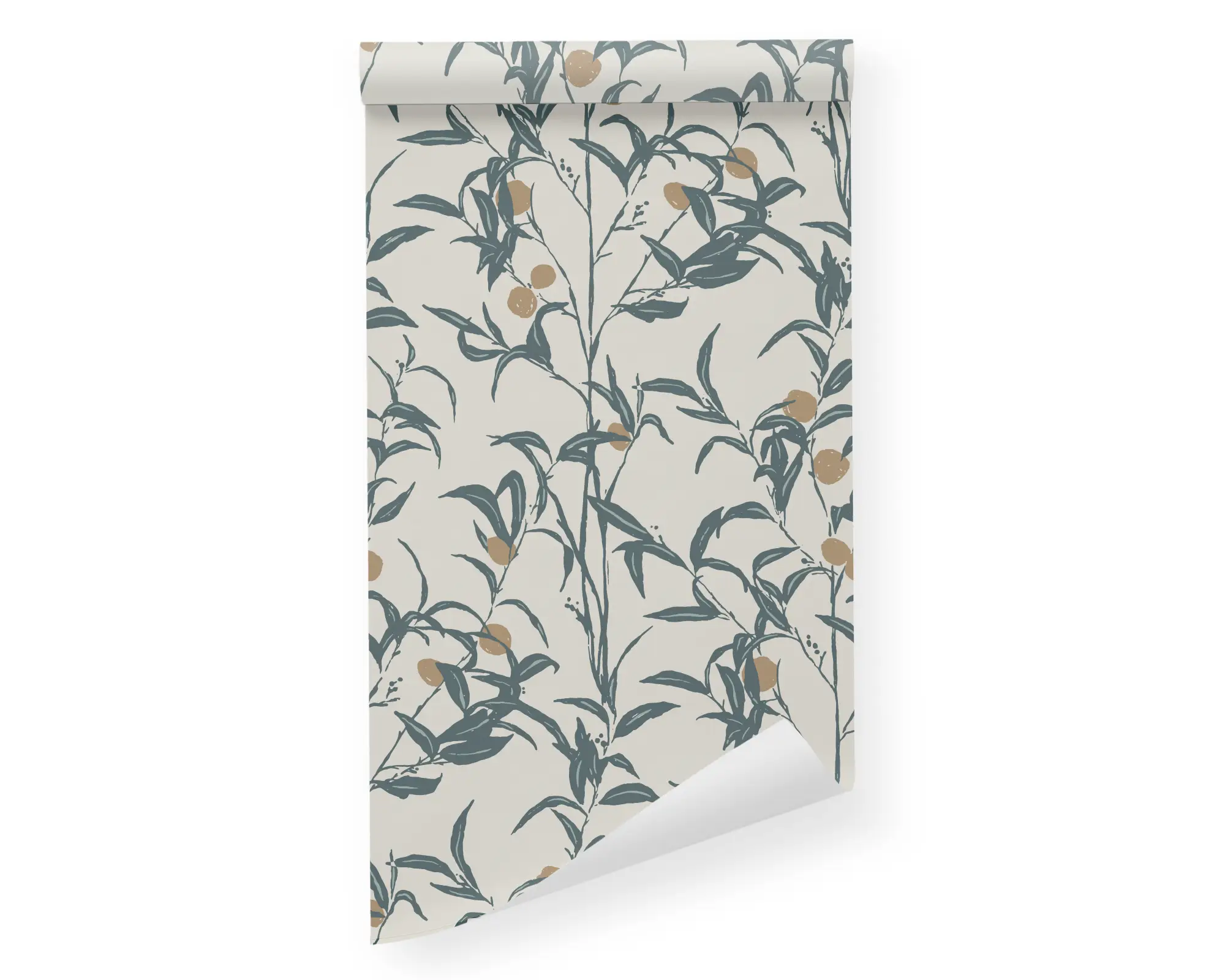 Give your home a sophisticated yet natural touch with our Orangerie Orchard Peel and Stick Removable Wallpaper. This design features thin branches adorned with delicate leaves and round citrus fruit. Available in any of our stunning colors and versatile paper types, this wallpaper is perfect for nearly any space.