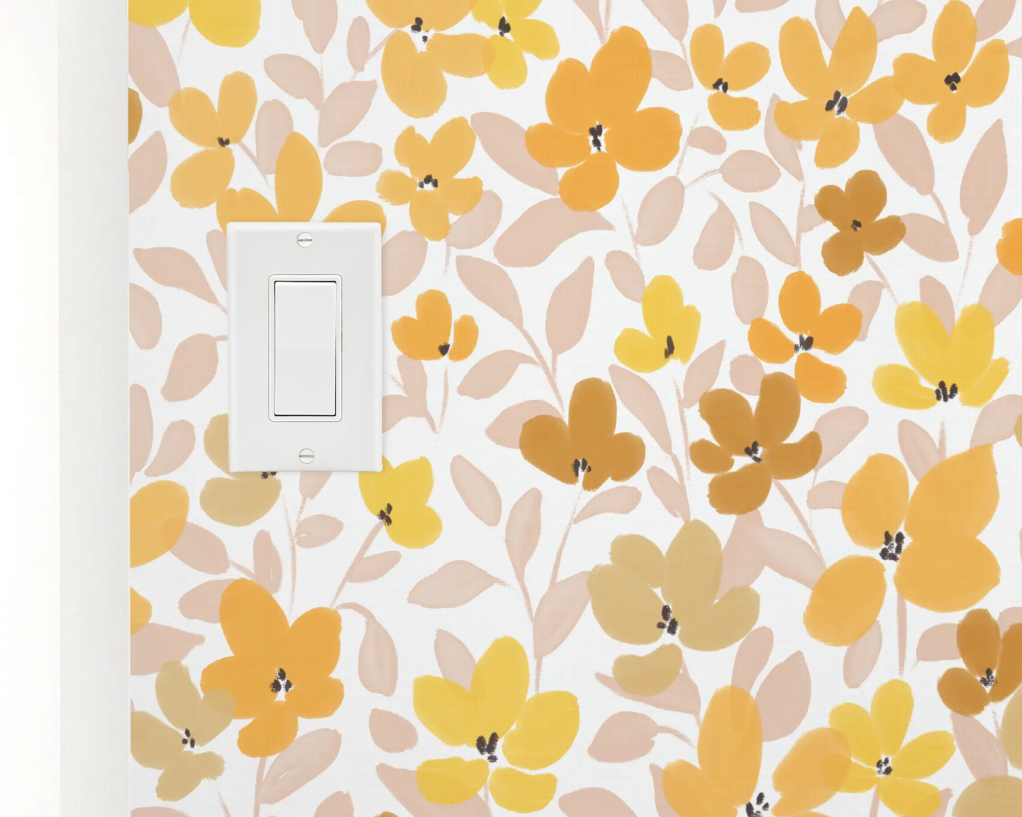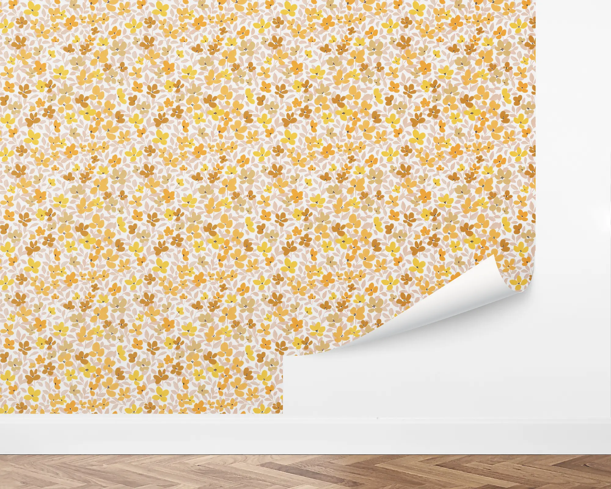 Give your walls a floral touch with our Painted Petals Peel and Stick Removable Wallpaper. Simple watercolor flowers and foliage are illustrated in shades of golden yellow, orange, and brown, spreading in a dense field over a white background. Choose from hundreds of possible colors to personalize the wallpaper and create a one-of-a-kind pattern that perfectly suits your space!