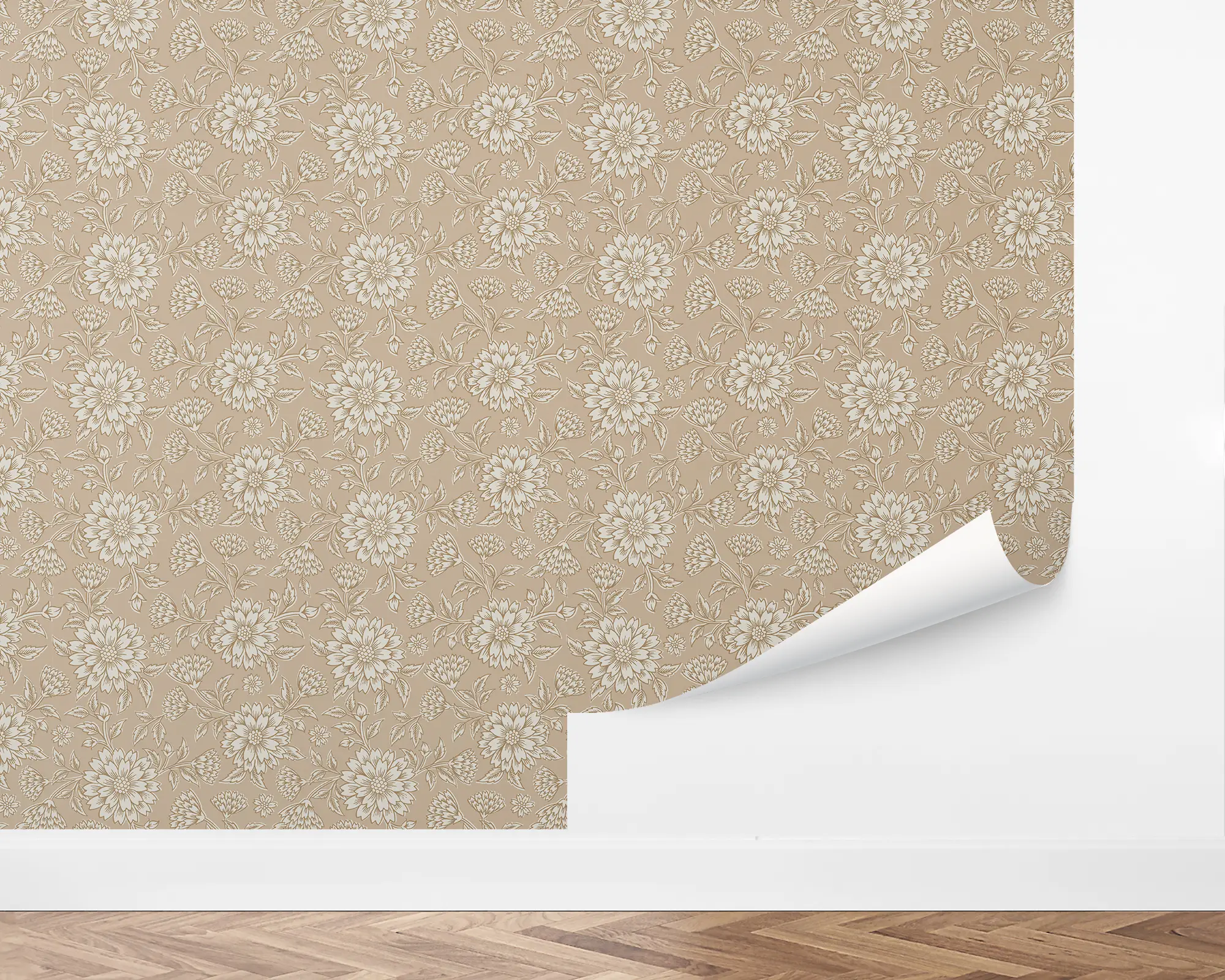 The Pressed Carnation Wallpaper features a delicate floral design of softly outlined blooms in cream on a warm taupe background. Inspired by hand-pressed botanical prints, this subtle yet elegant pattern adds natural charm and timeless appeal to any room. Perfect for dining rooms, bedrooms, or entryways, this peel and stick wallpaper brings quiet sophistication and warmth to both modern and traditional interiors.