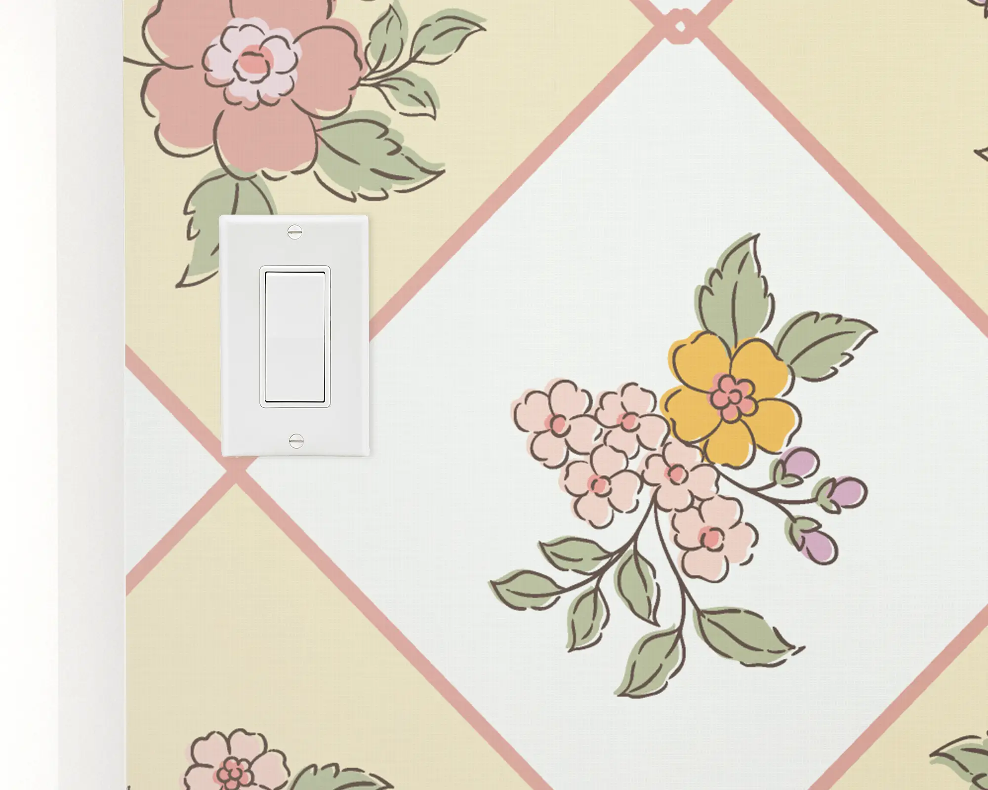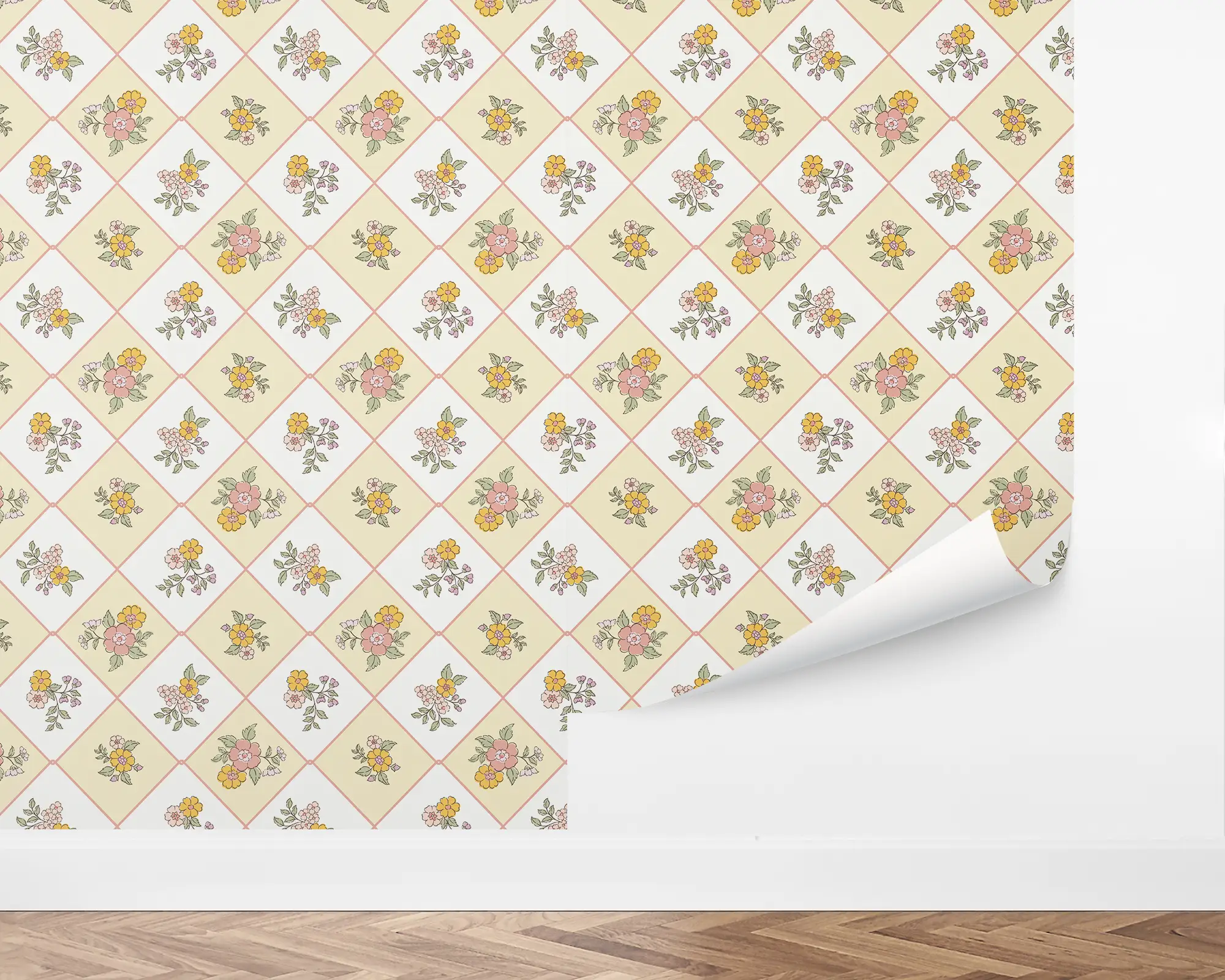 The Retro Botanicals Wallpaper blends mid-century charm with modern floral flair, featuring pastel yellow and blush diamond tiles adorned with hand-drawn flower clusters. This playful vintage-inspired pattern adds warmth and character to kitchens, entryways, or creative studio spaces with its nostalgic yet fresh look. Transform any wall into a cheerful statement with this easy-to-apply, removable peel and stick wallpaper—perfect for renters and style enthusiasts alike.