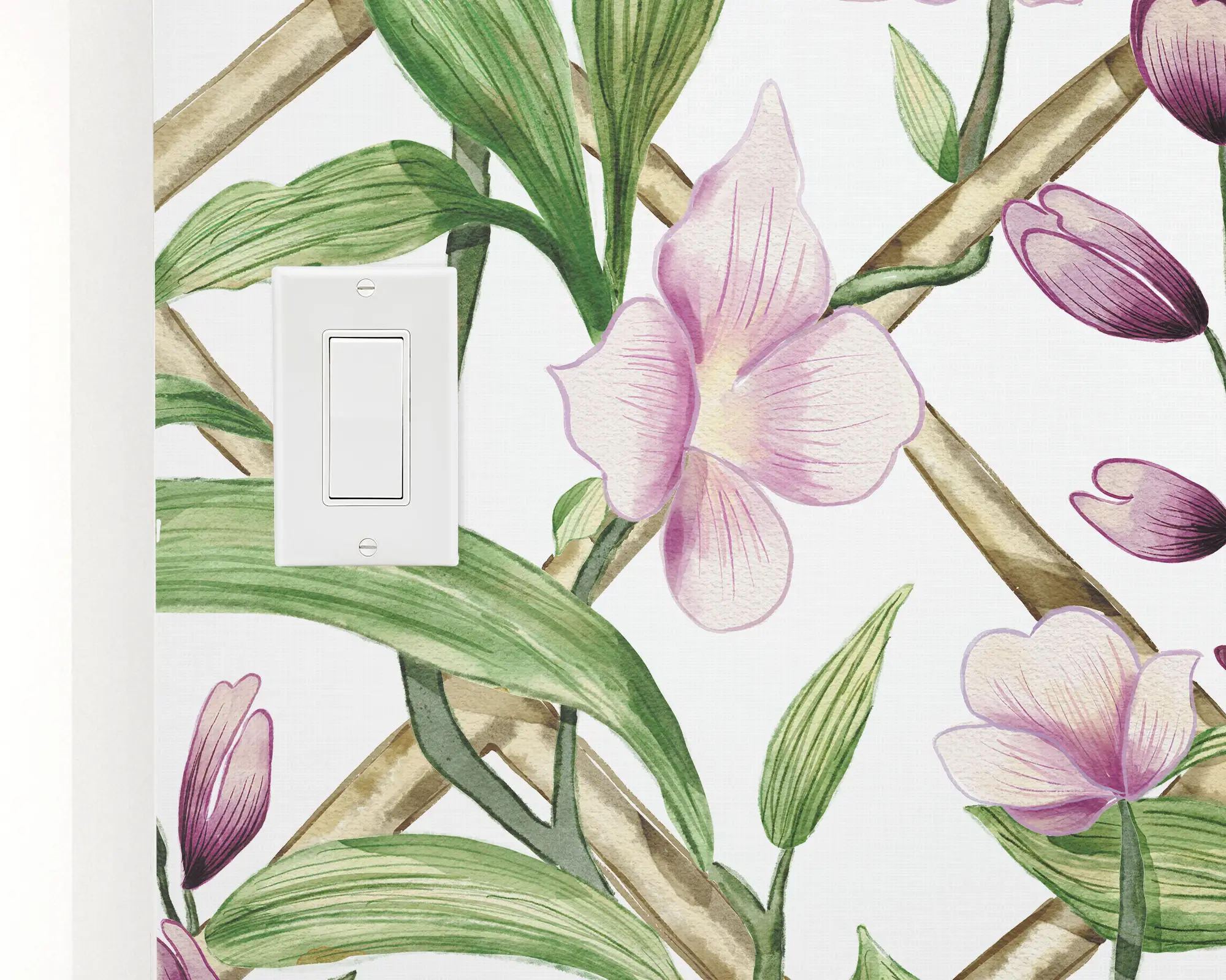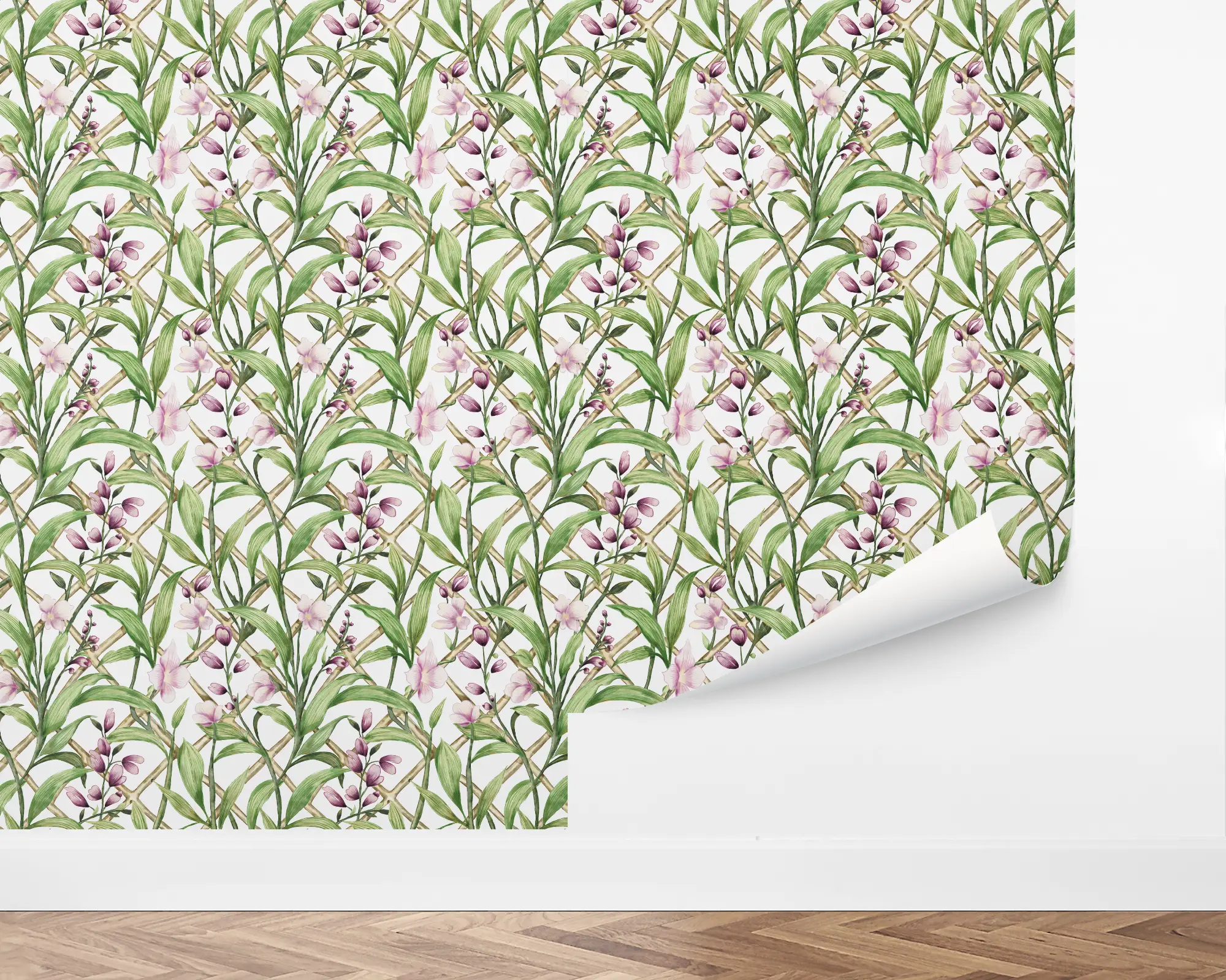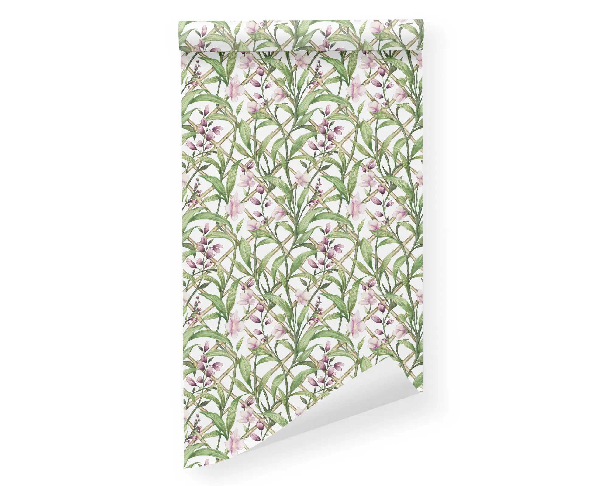 Add a classic trellis design to any wall in your home with our Whispers of Spring Peel And Stick Removable Wallpaper. Realistic illustrations of pink flowers grow on a diamond pattern, set on a white background. Personalize with endless color combinations to match your interior style perfectly!