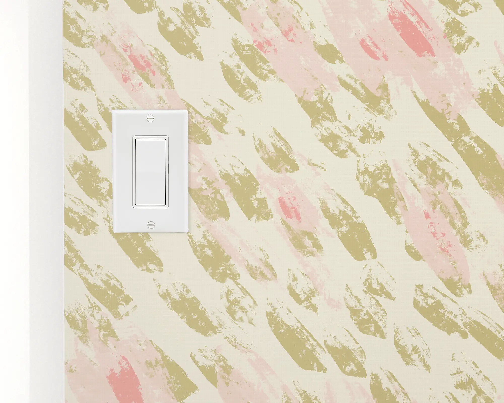 Wild Meadow wallpaper features a scattered, hand-painted pattern of soft pink and sage green brush marks on a warm cream background, creating a breezy, nature-inspired look. This abstract floral design brings fresh movement and a touch of whimsy to entryways, bedrooms, or living rooms, blending modern style with organic charm. Refresh your space with customizable peel and stick wallpaper—perfect for cheerful, airy interiors.