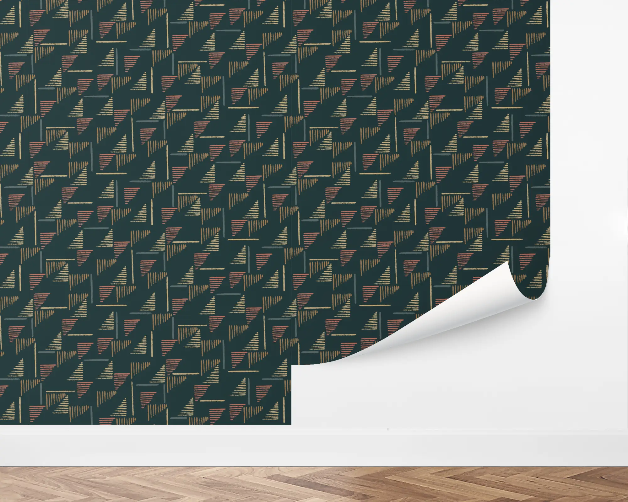 Create something exciting and jazzy with our Woven Comfort Peel and Stick Wallpaper. This fun design features lined triangles dancing across a dark green background. Fully customizable with any of our beautiful colors, this design is perfect for any eclectic.