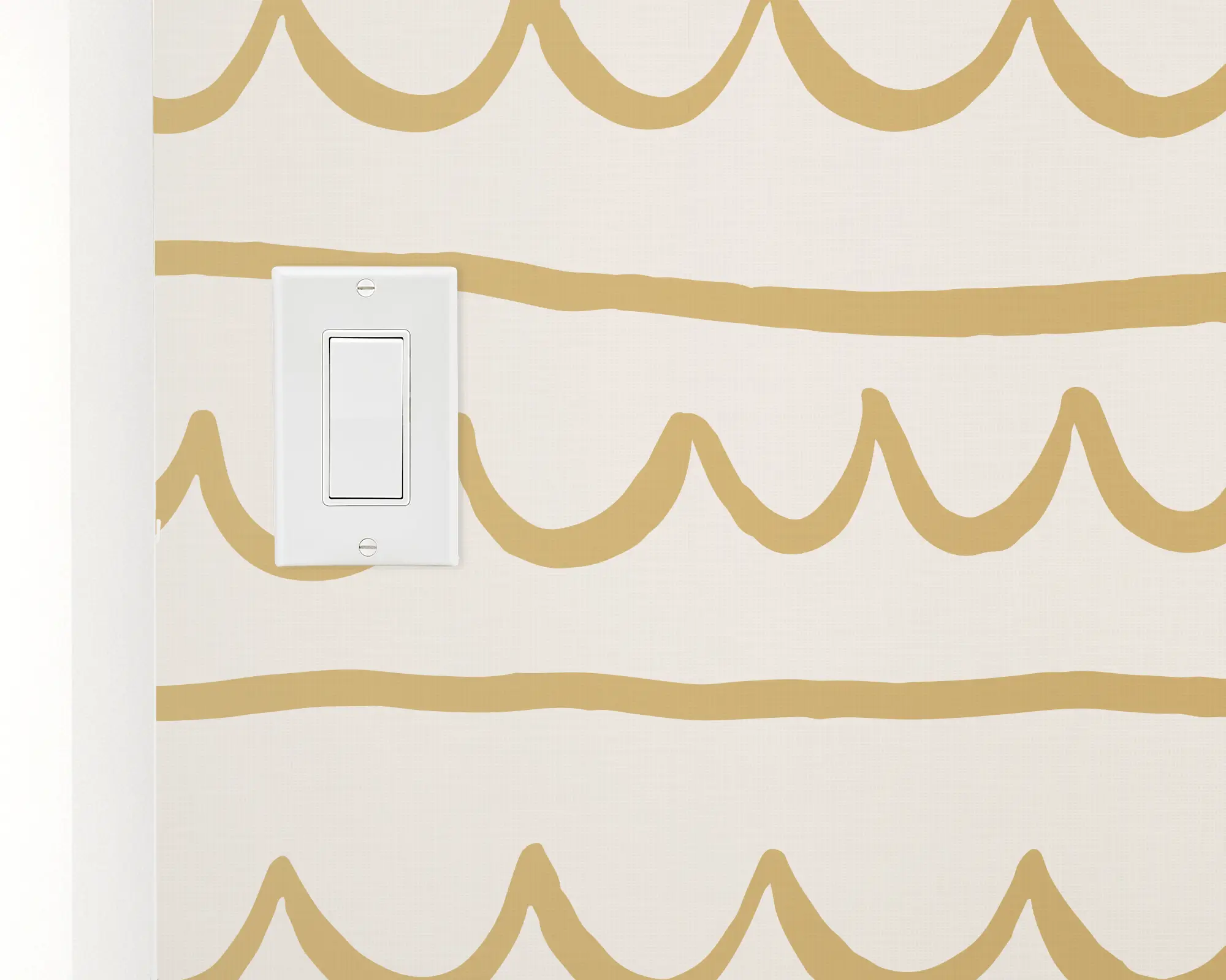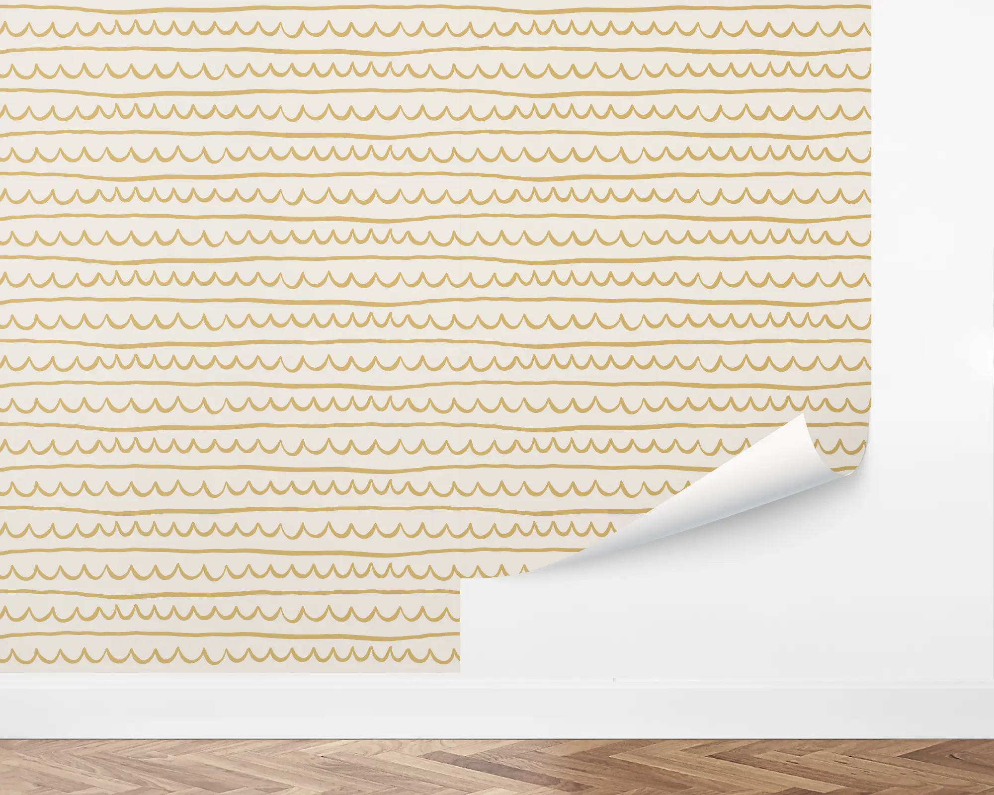 Add a silly and fun touch to your child's room with our Wavy Lines Peel and Stick Wallpaper. Golden stripes and squiggles are drawn in rows against an ivory background. Personalize with your favorite color combinations to be perfect!