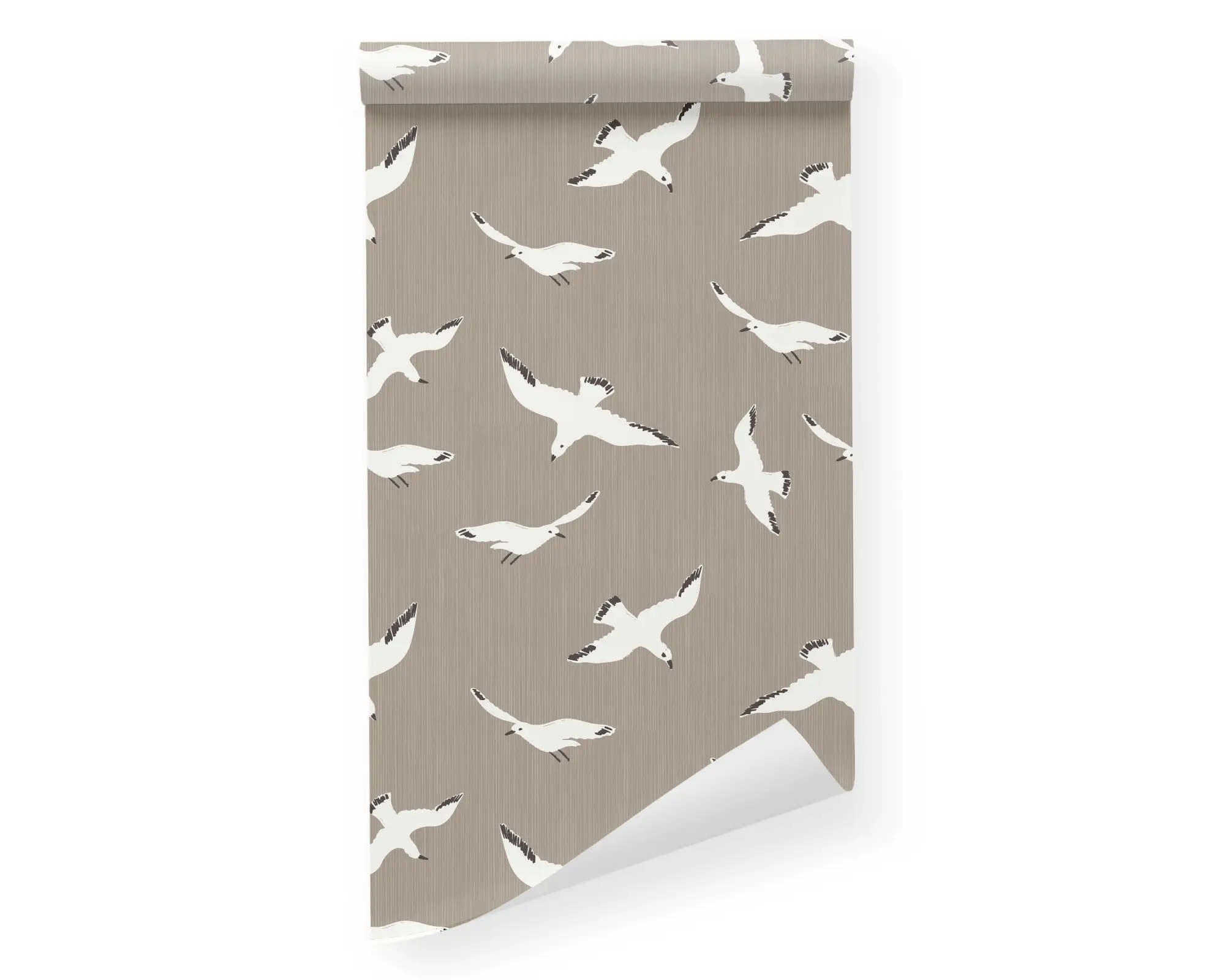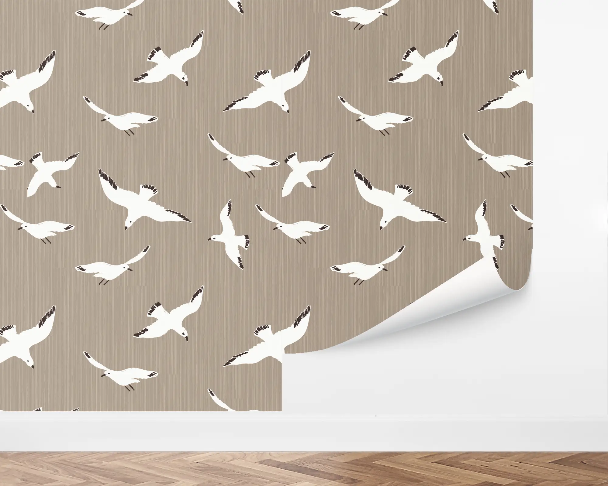 Create a unique, eclectic space with our White Birds Peel and Stick Removable Wallpaper. This design features soaring seagulls over a striped, neutral background. Customizable with any of our stunning colors, this wallpaper is perfect for any space, from craft room to vacation rental.